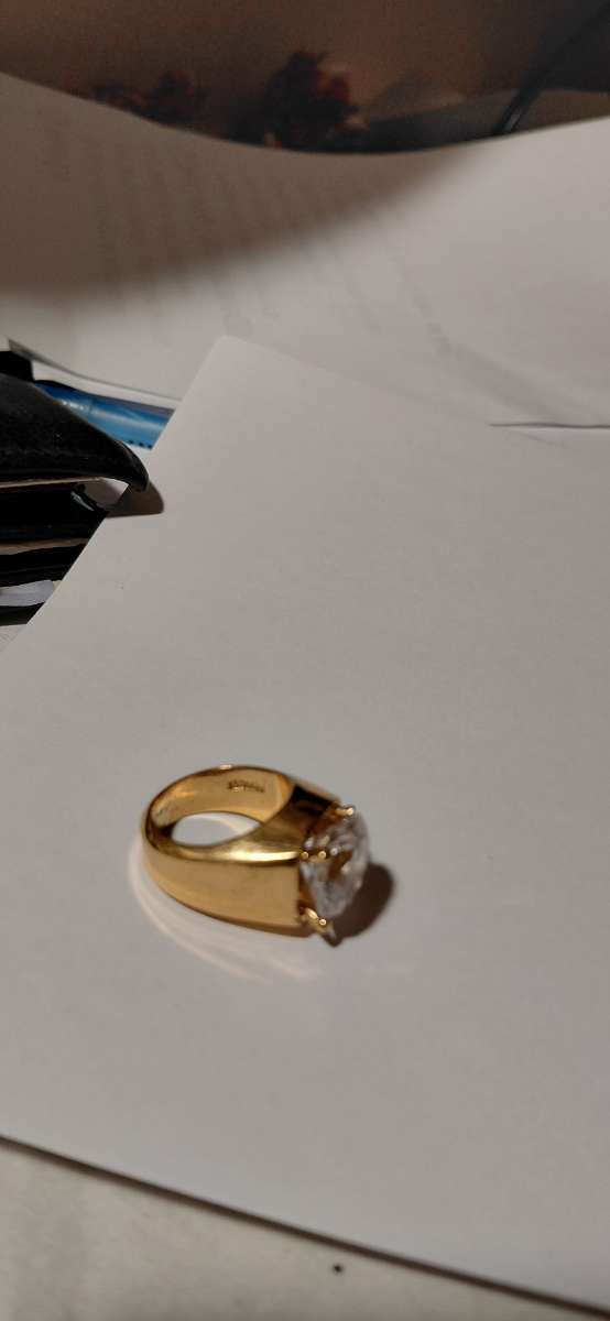 Physical Description: This ring features a substantial gold band with a prominent, clear stone set in a four-prong setting. The band appears to be made of yellow gold, likely 14K or higher, based on its color and weight. The dimensions of the ring are approximately 0.75 inches in height and 0.5 inches in width at the stone. The stone is round and appears to be a diamond or a high-quality cubic zirconia, exhibiting significant brilliance.