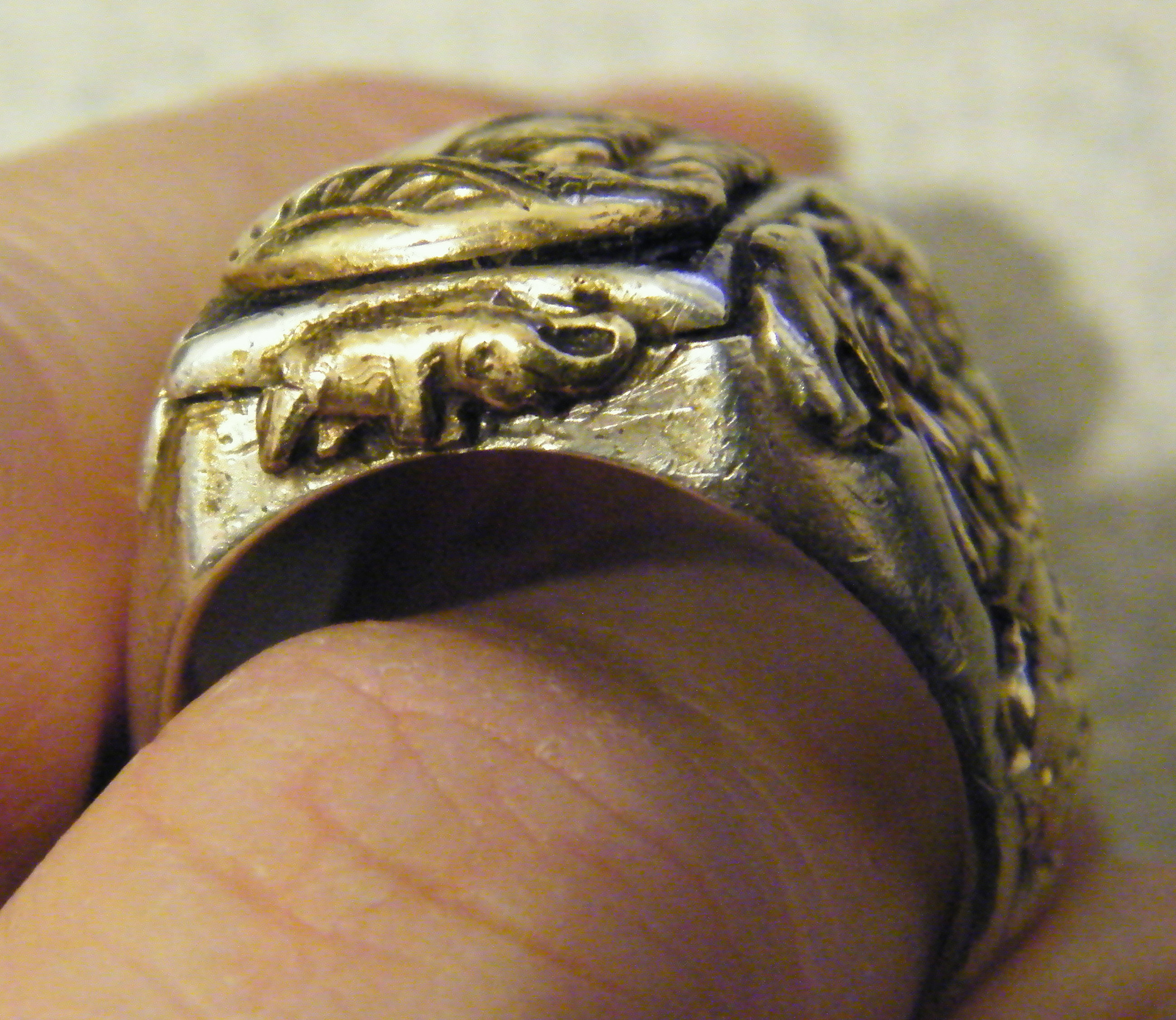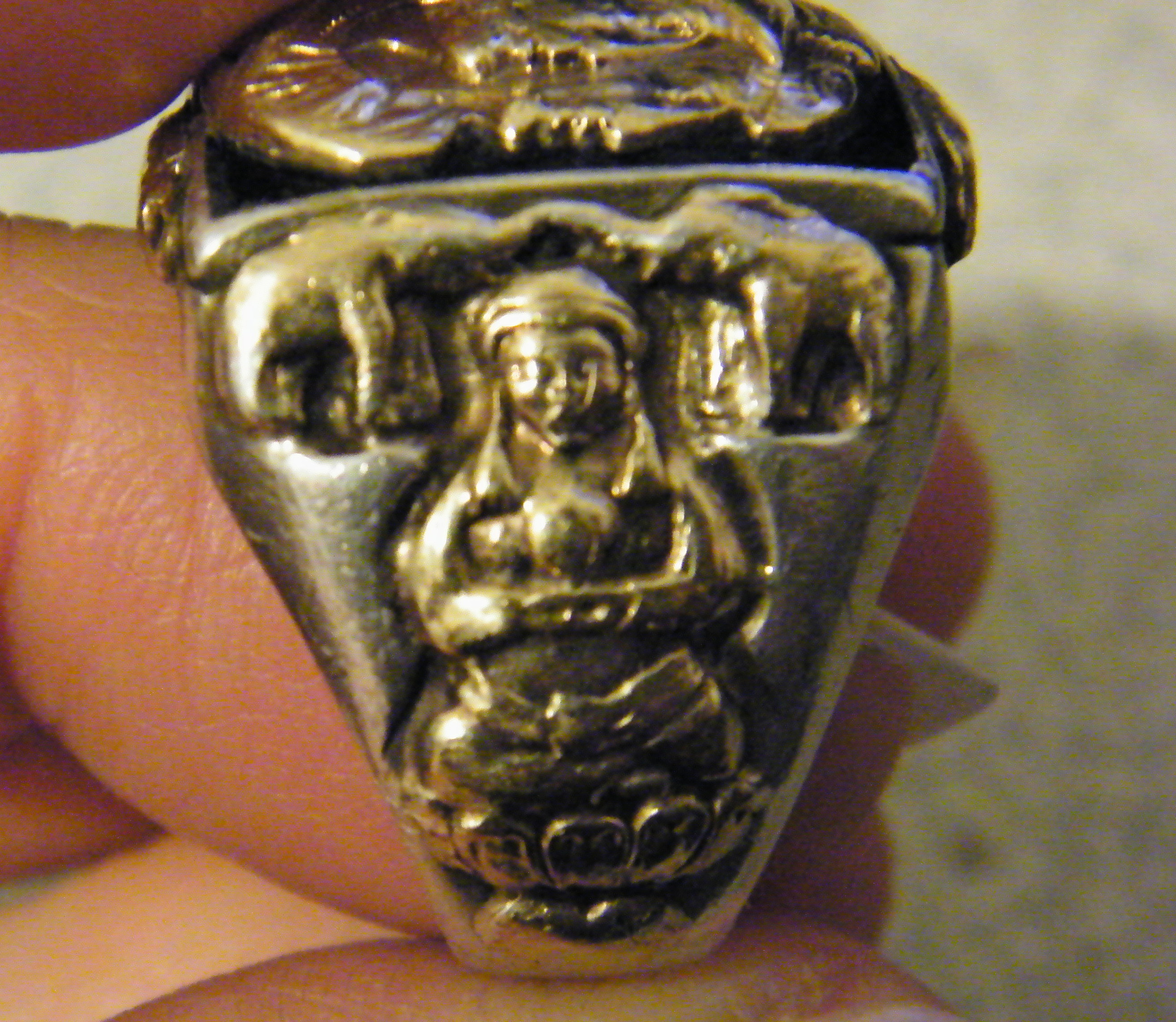 The main body of the ring is done in Sterling silver. The top of the ring has what looks to me like a Man and Woman, with the womans head behind the mans. They are made of Gold. They are raised about 1/4" high on a black background which is most likely onyx, but I don't know this for sure without it being tested. On each open side of the ring there is an elephant in gold. On each shank side of the ring, all in gold, there are two elephants with their trunks touching and they are standing over a Goddess sitting on a Lotus Flower. Under each Lotul Flower, also in gold, is a Heart. The ring is marked on the back with "Sterling/10K". The top of the ring measures about 1" by 1". The ring is slightly out of round, but it measures appox. 1 3/16" from the top to bottom and 7/8". The ring weighs 2 full ounces. I think it's about a size 10 to 10.5. I am hoping to find out perhaps some history of the ring as well as a value. The price wanted for the ring is $650.00 if anyone is interested. This is based on a previous appraisal of $650-$850 from "JustAnswer" and pricing it at the lower end. This is a rare and unusual ring that you would be happy and proud to wear or give to a loved one, especially if the symbols have special meaing to you. It seems to me like it has "love" as it's meaning because of the hearts, the elephants for longevity and the goddess, as well as the man's and woman's heads together.