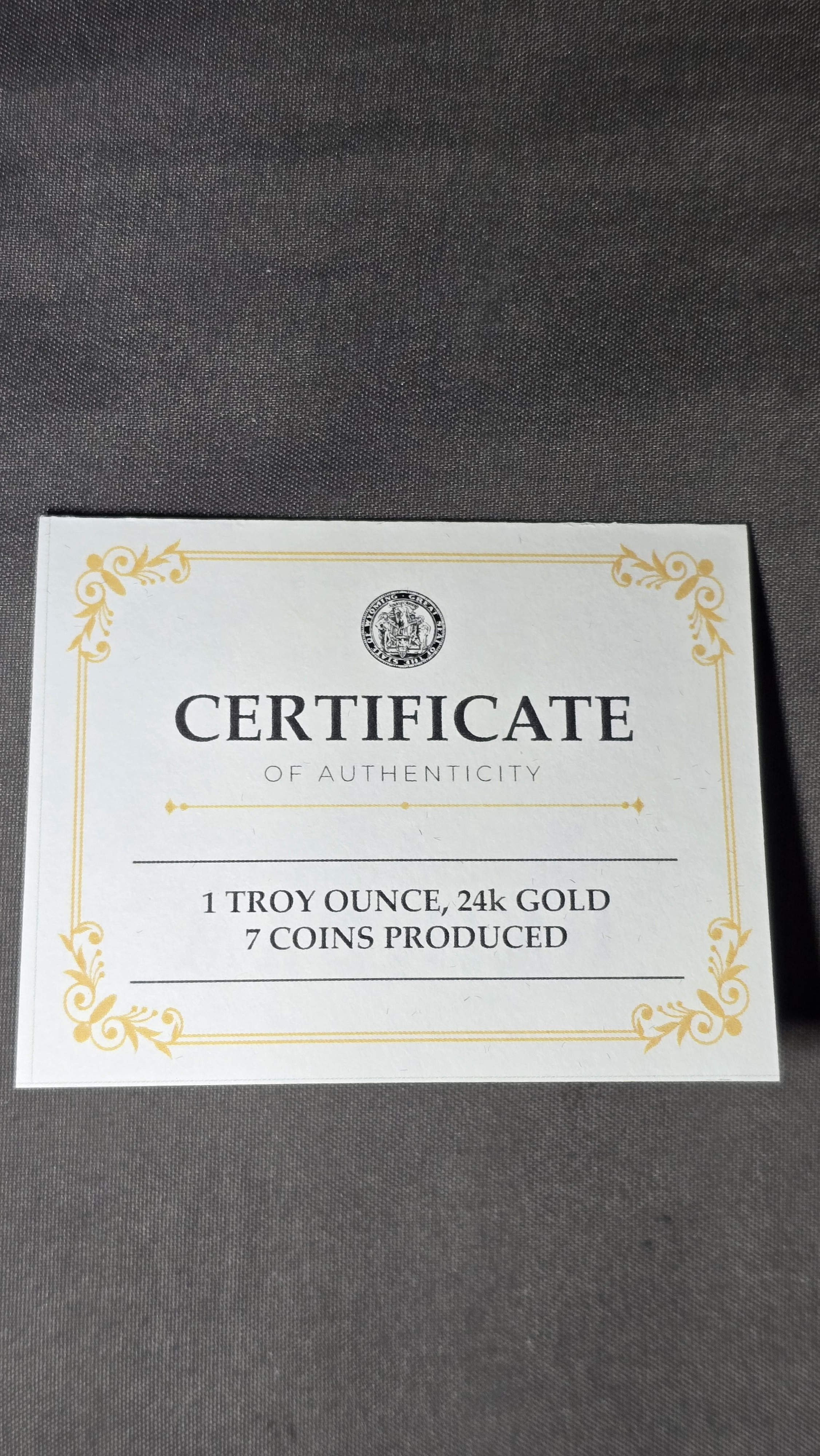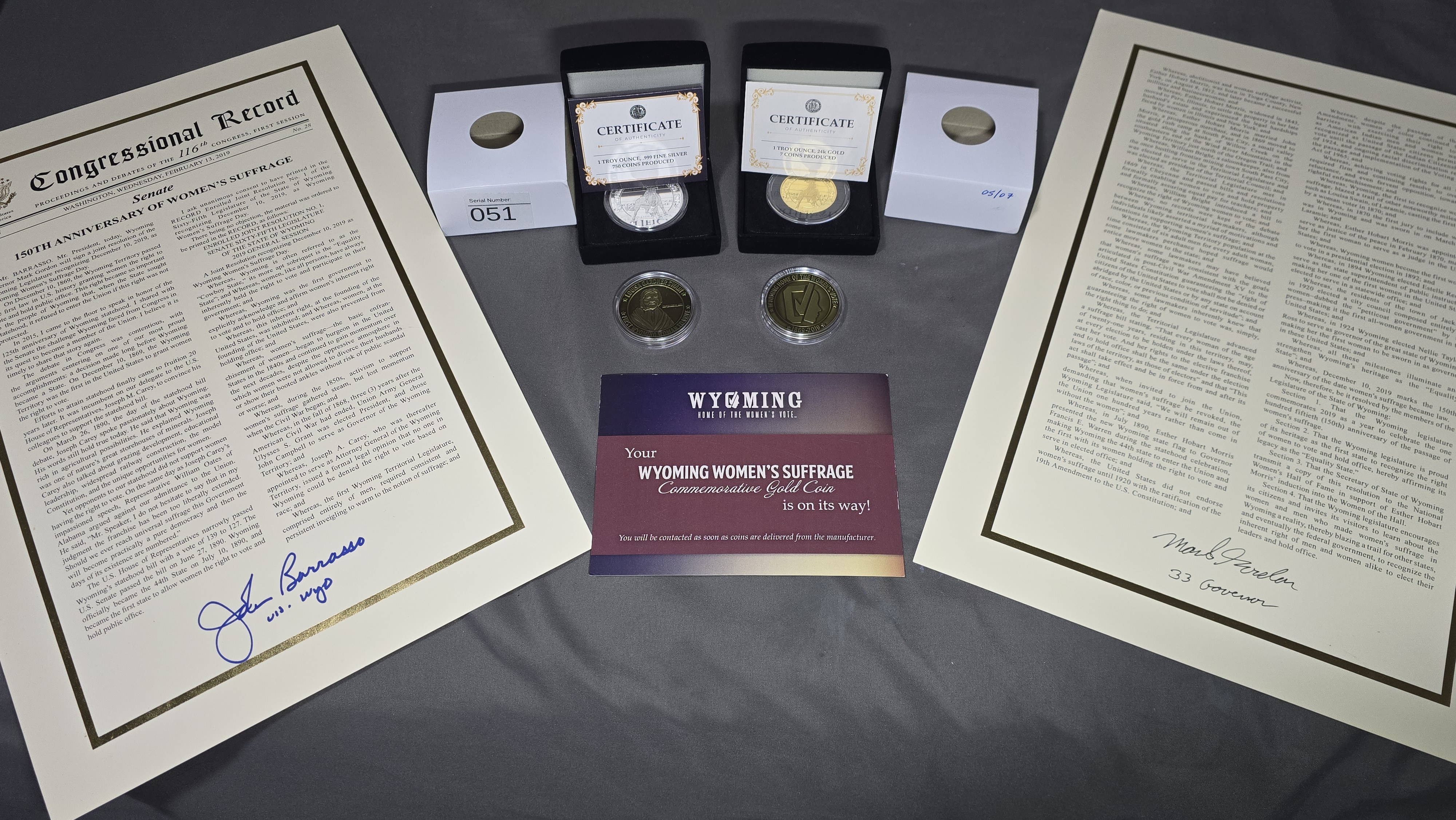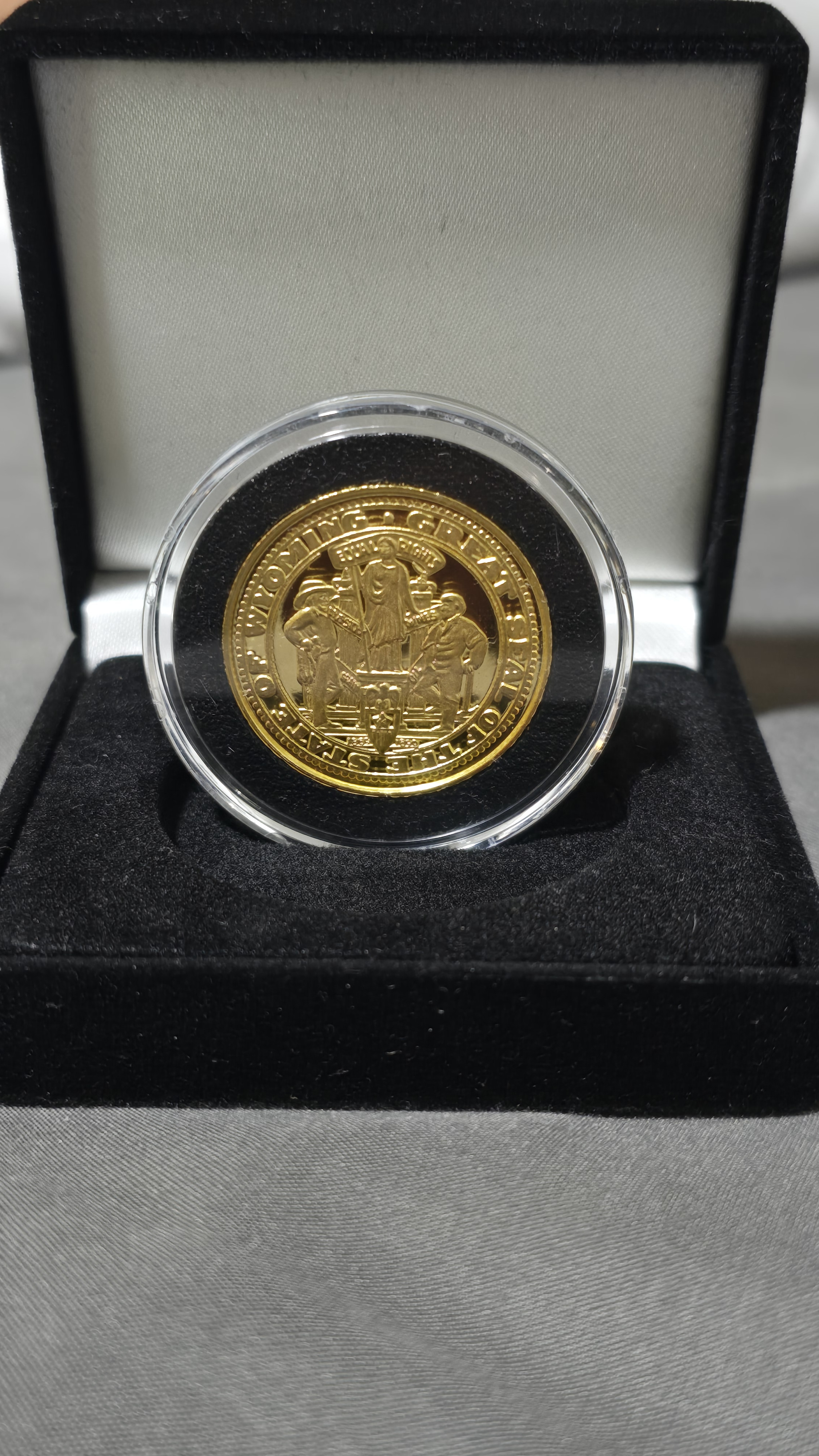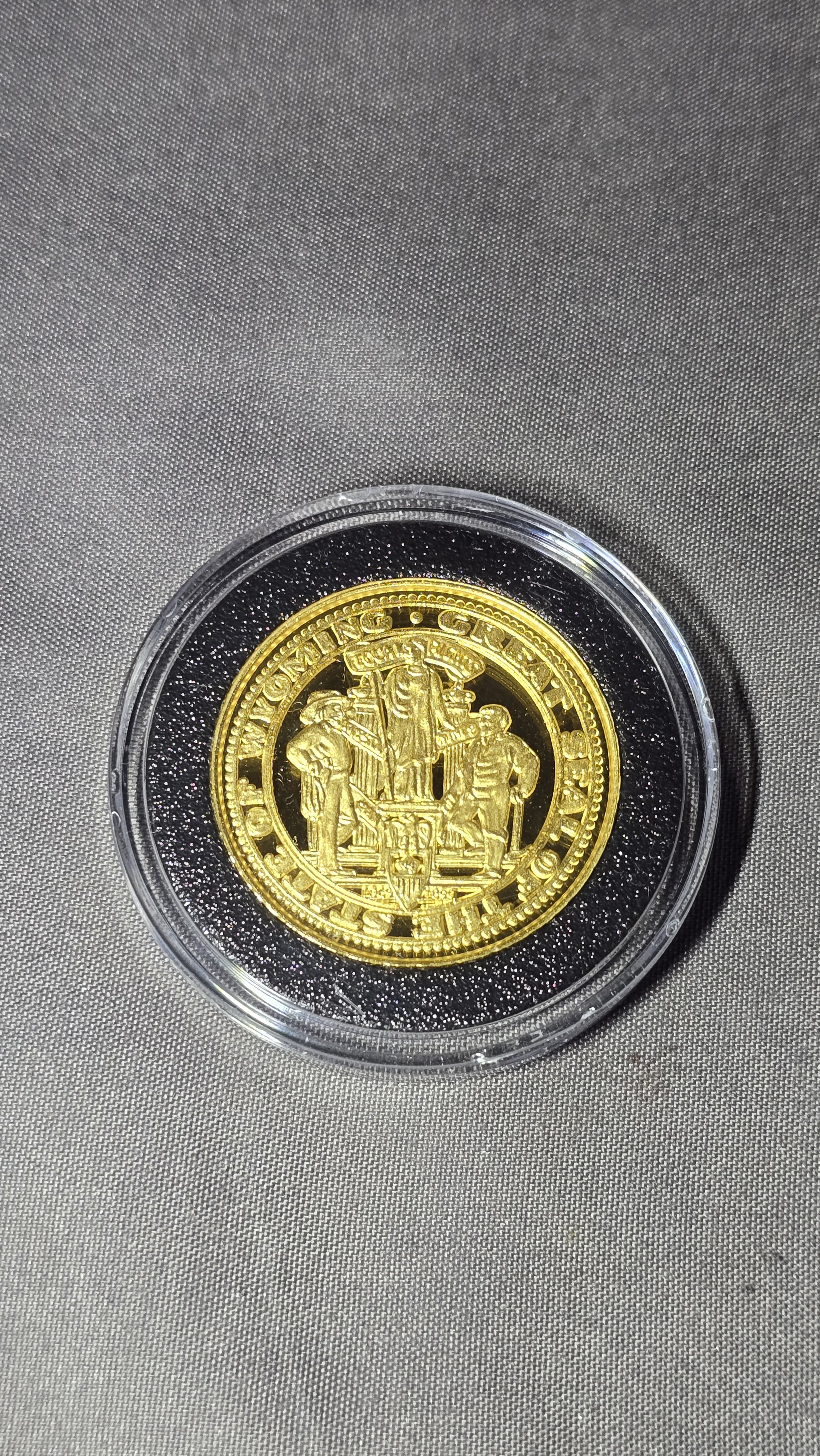 Additionally, I also have two other coins like this gold coin as part of a collection. I also have a resolution from the United States Senate provided by Senator John Barrasso. The resolution contains his signature, the signature of the Wyoming Governor, Mark Gordon, and the signatures of the Representatives and Senators from the Wyoming Legislature, including my own (I served as a state rep from 2015 to 2021). While I'm not necessarily asking for an appraisal of all three individually, I thought it would be worth mentioning just in case this somehow adds to the value.