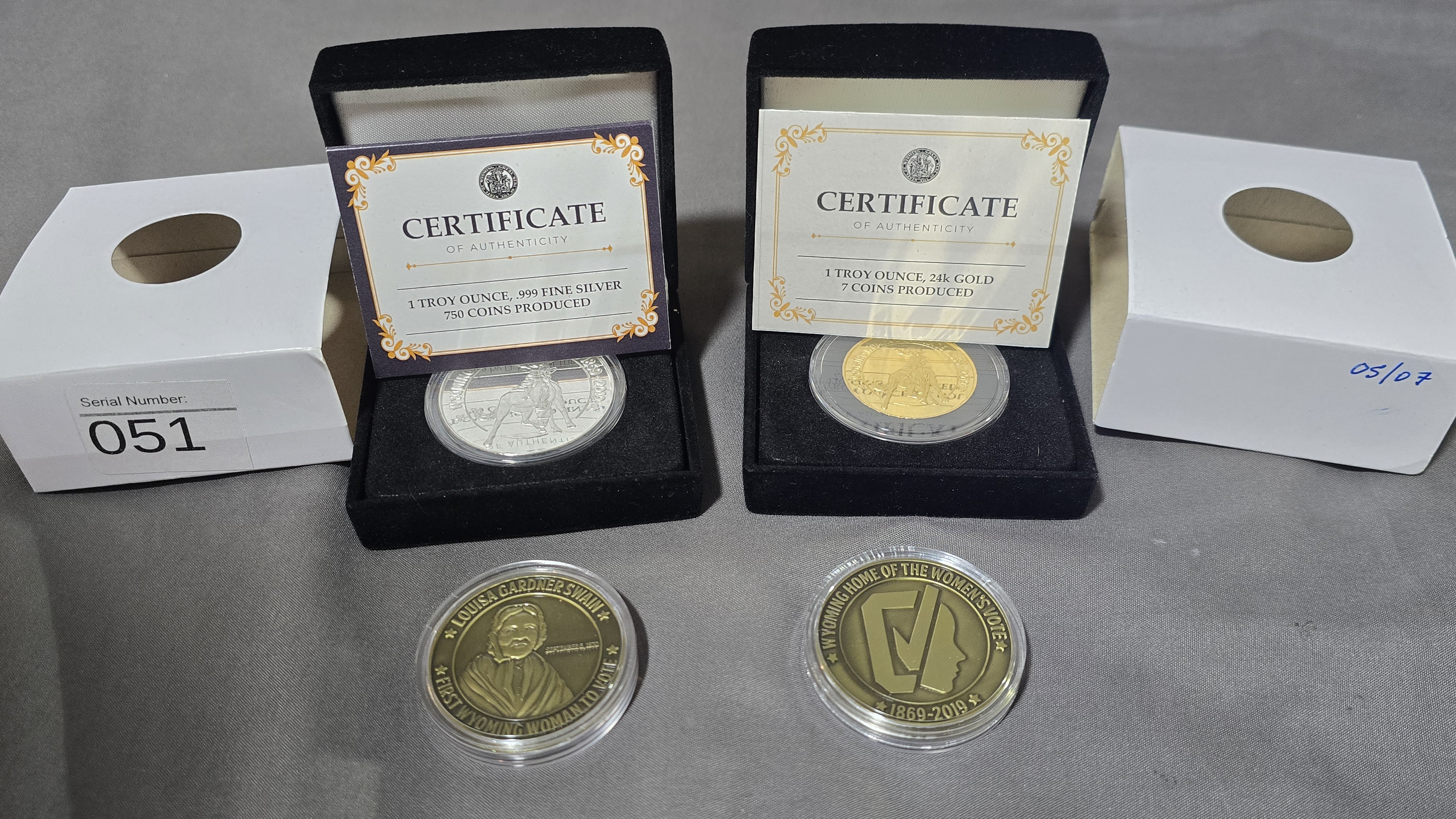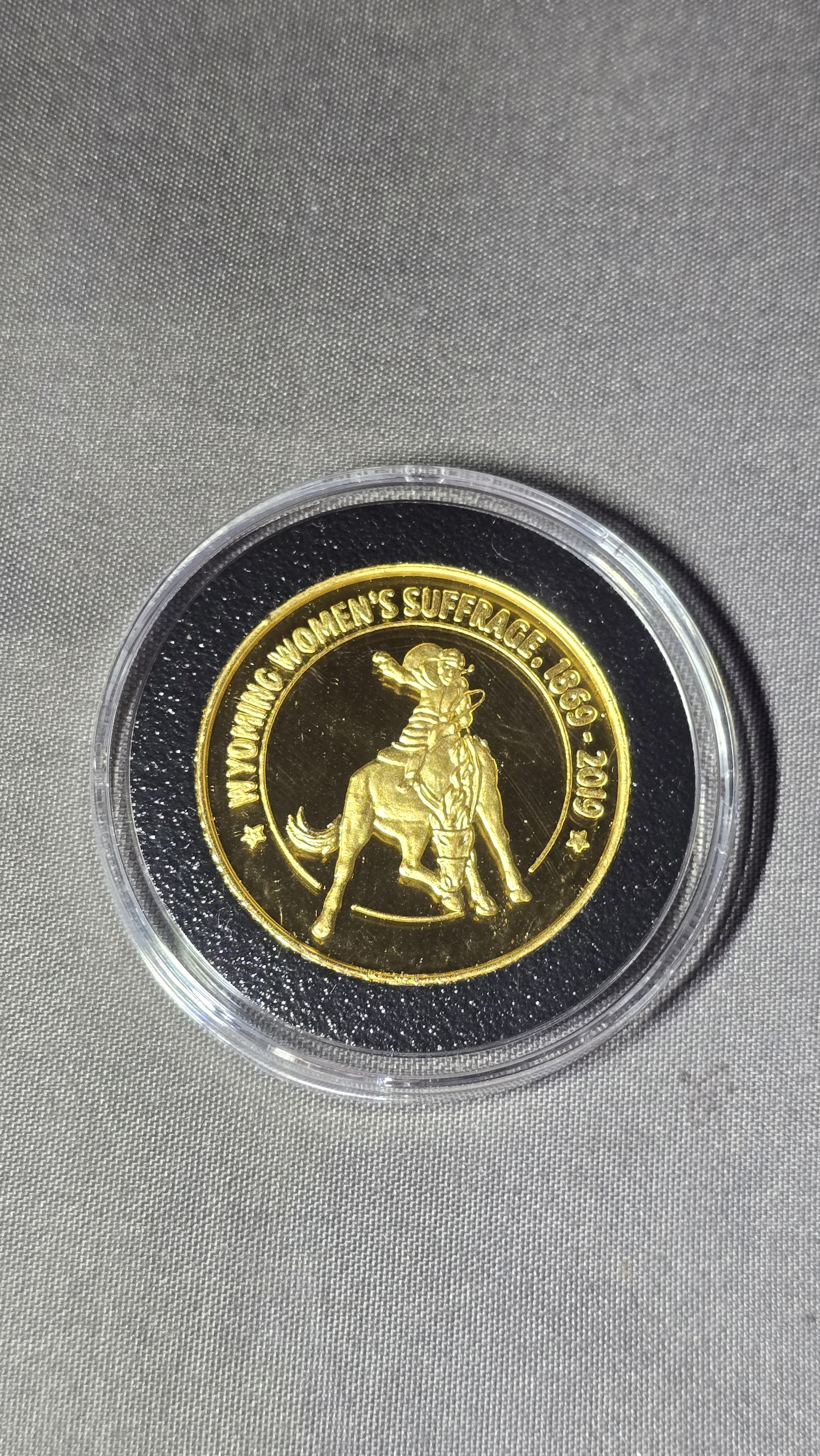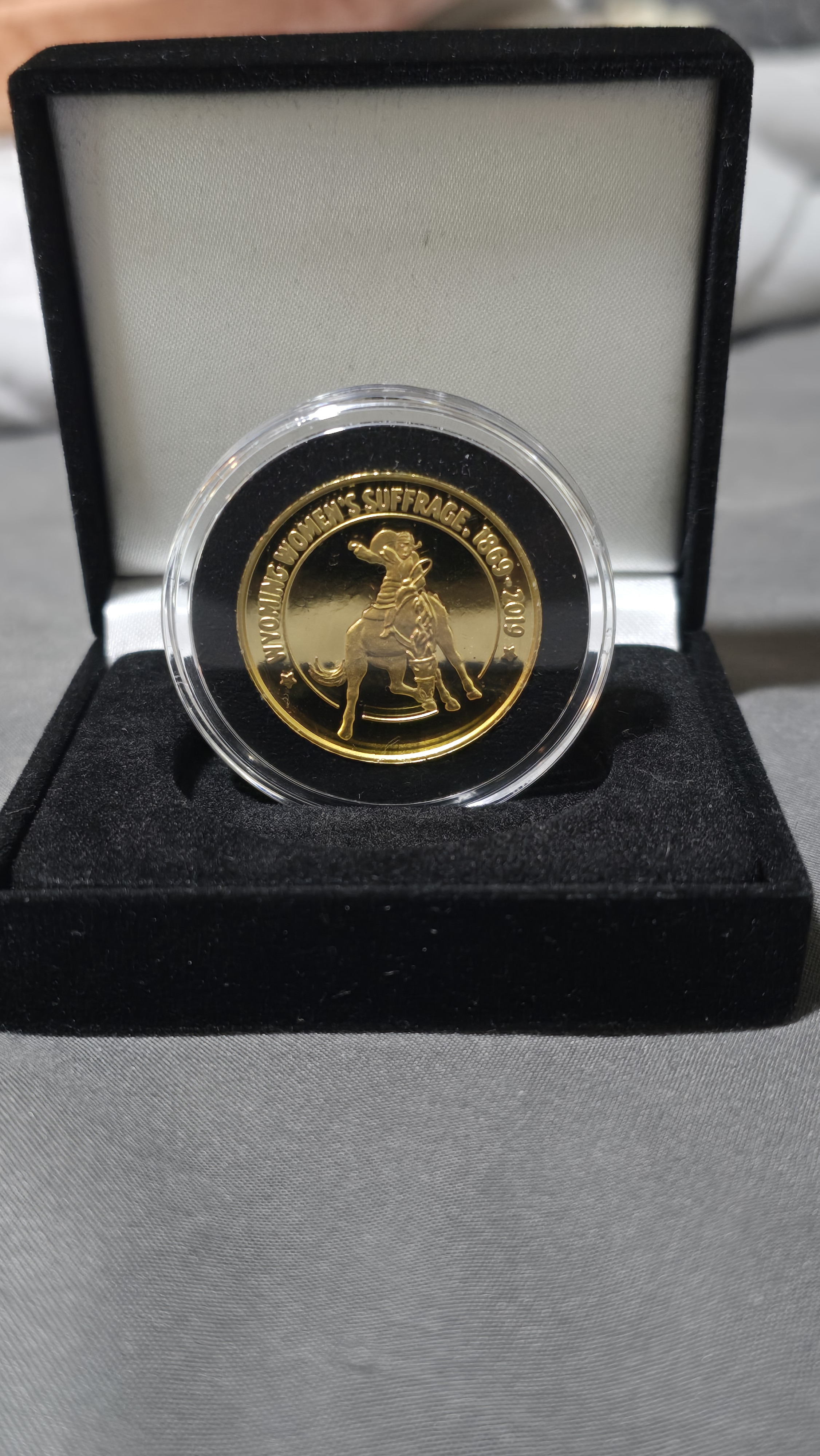 I have a 1 troy ounce, 24k gold coin, minted in 2019 in commemoration of the 150th anniversary of women's suffrage in Wyoming. Wyoming was the first state in the US to allow women the right to vote. This coin was minted by the State of Wyoming's State Parks and Cultural Resources agency through an appropriation made by the Wyoming Legislature in the 2019 budget. There were 7 gold coins made. This one is number 5. It comes with a certificate of authenticity. The encased coin came packaged in a coin box with a white sleeve. On the sleeve it reads "05/07" written by hand.