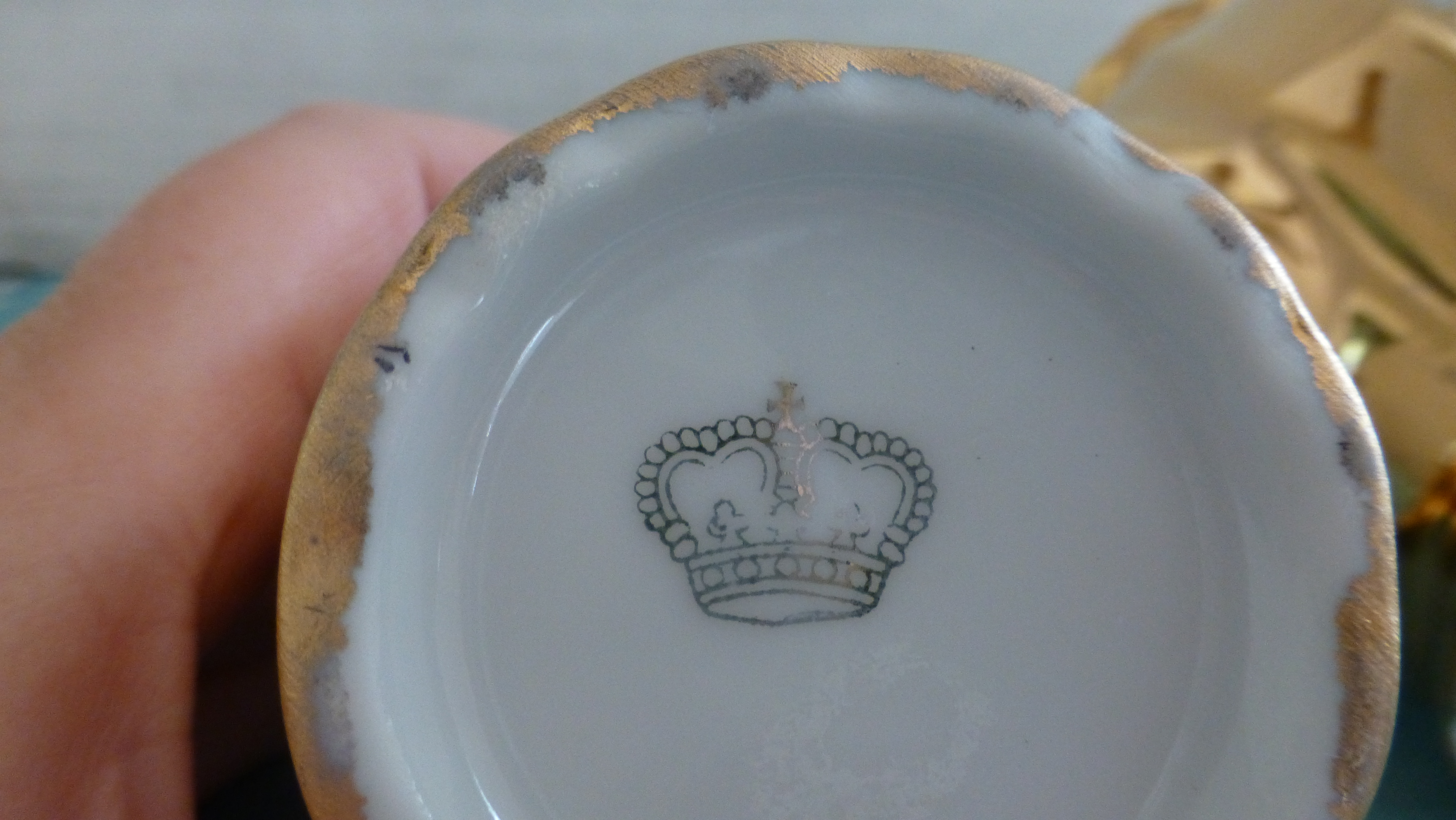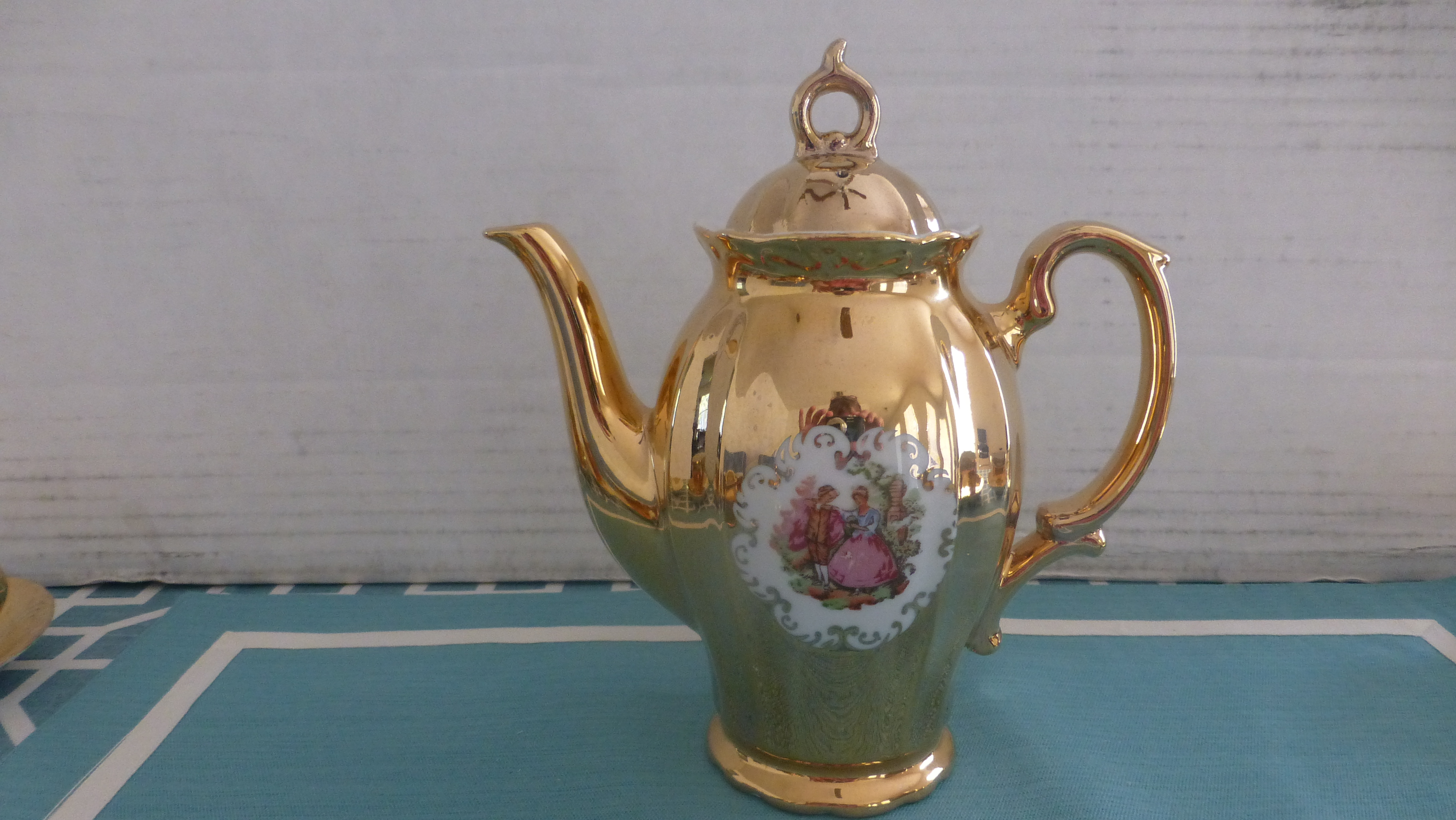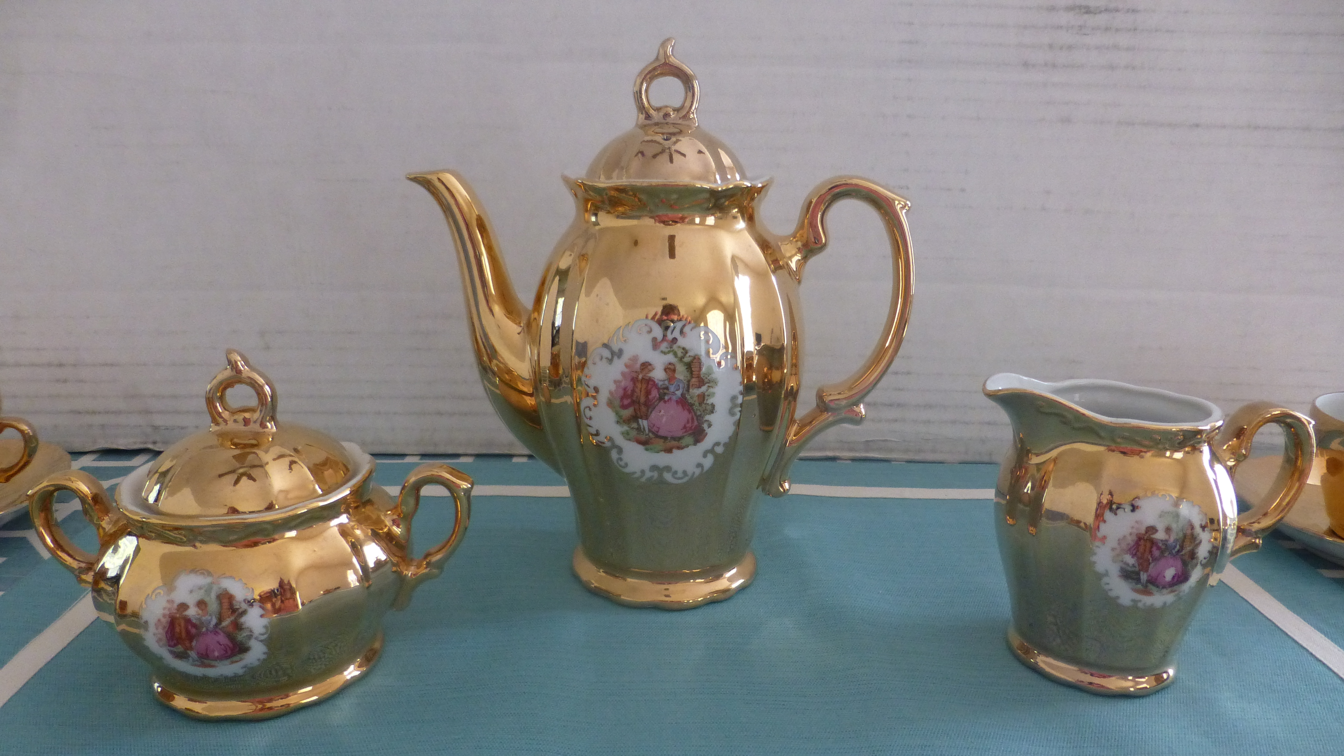 17 piece Miniature Gold Tea set with a man & woman in a garden setting on each peice (except the saucers). Set is 1 Tea pot with lid, 1 sugar bowl with lid, 1 creamer, 6 cups and 6 saucers. Gold crown mark on bottom of each peice, no writing.