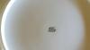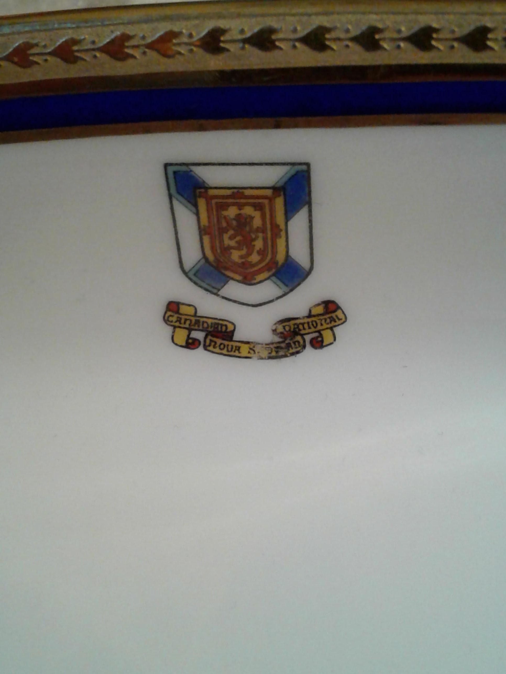 gold rimmed, white, and blue gravy boat with plate. has a Canadian symbol on it