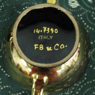 This is a gold-toned sugar and creamer set that is in excellent condition. The bottom is marked FB & Co. 14.7390 Italy. I cannot tell what material this set is made out of. The outside gold glaze feels like ceramic material. Would appreciate any information.