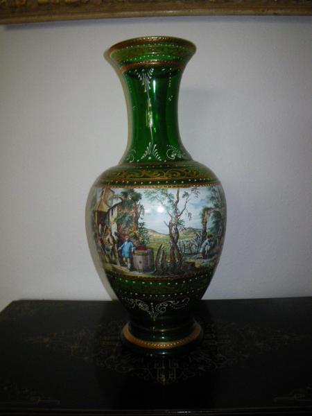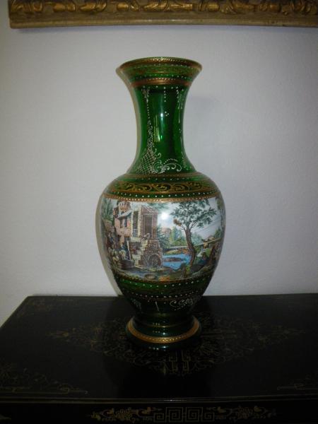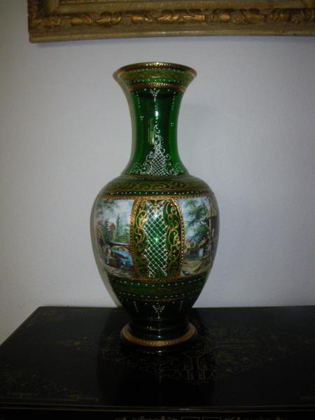 This is a green vase that has gold trim and painting surrounding the main part of the vase. My grandmother said that the gold is supposedly 24k, I have no way of knowing if that is true or not. There seems to be an imperfection in the glass where it denting in when it was cooling possibly. See pictures below.