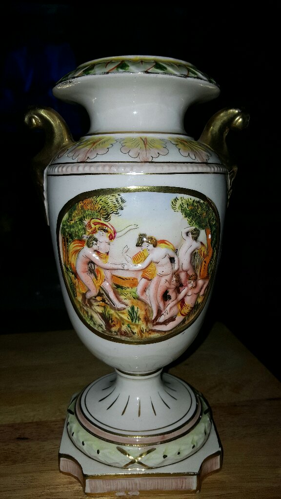 I have a gorgeous gold trimmed vase or urn with cherubs or angels on both sides with different scenes it's square on the bottom with Drunlt or Brunlt Italy 4004 written on it. It's a beautiful urn with bright colors.