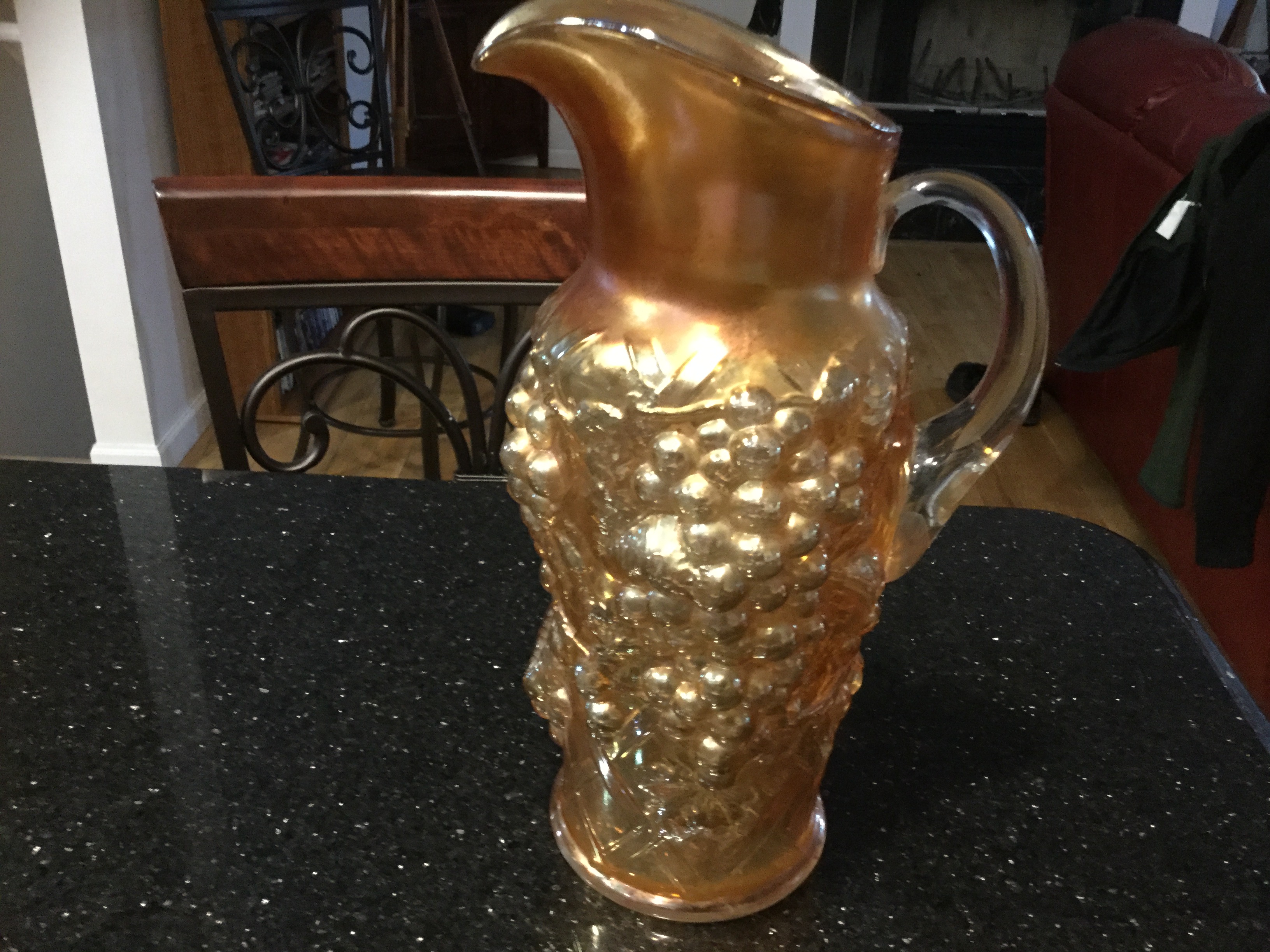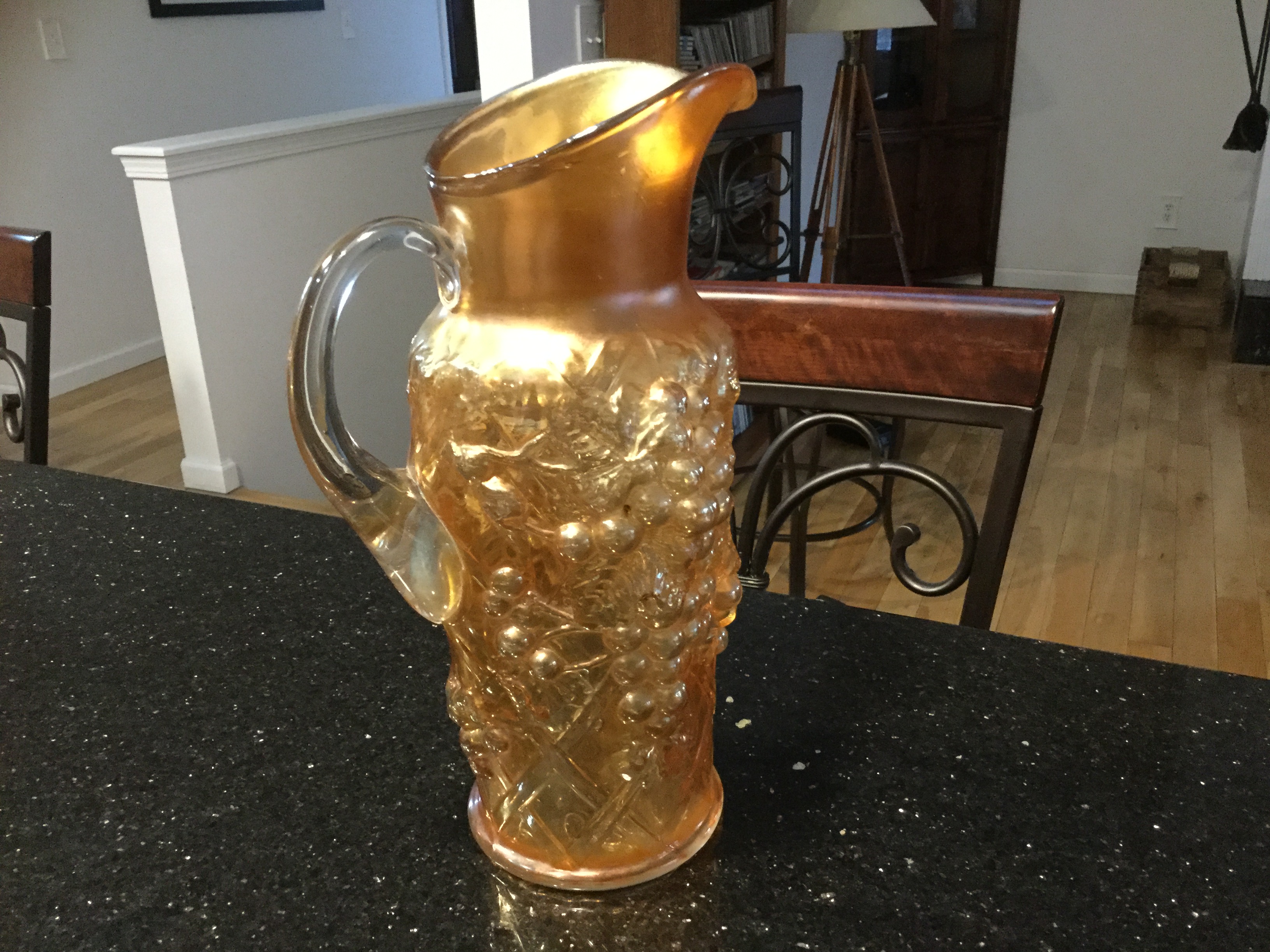 This was given to us from my 80 year-old mother-in-law who said it came from her grandmother. There doesn’t appear to be any markings on the bottom to indicate its origins. It has a grape motif. We are wondering what it’s worth and any other information about it.