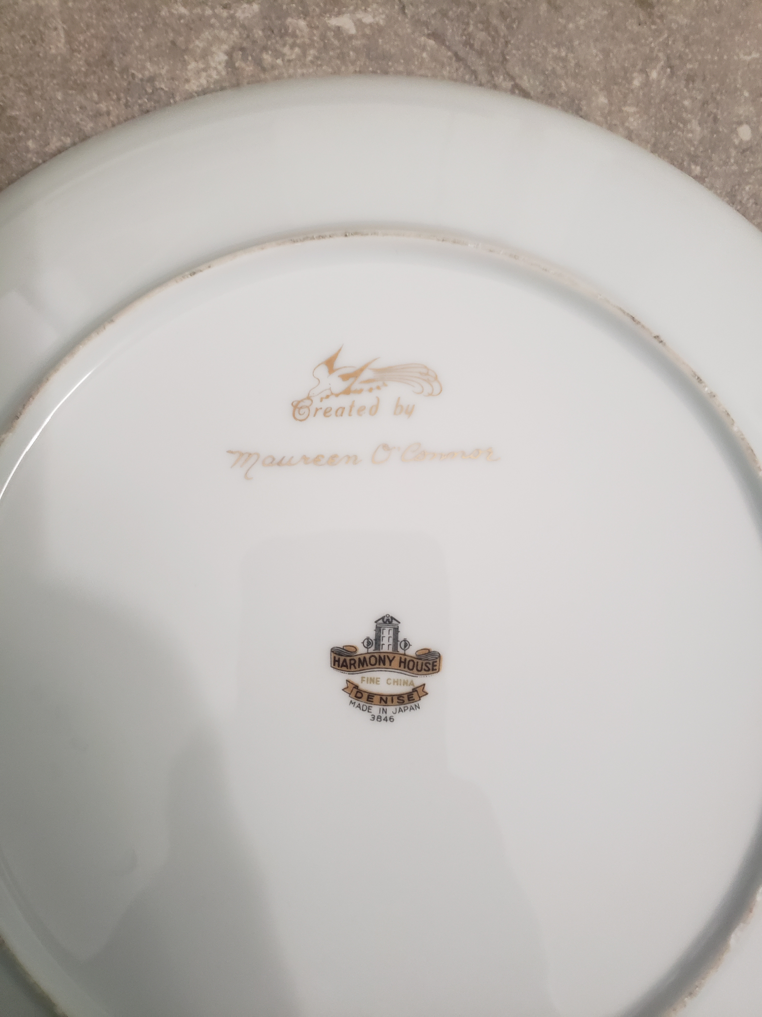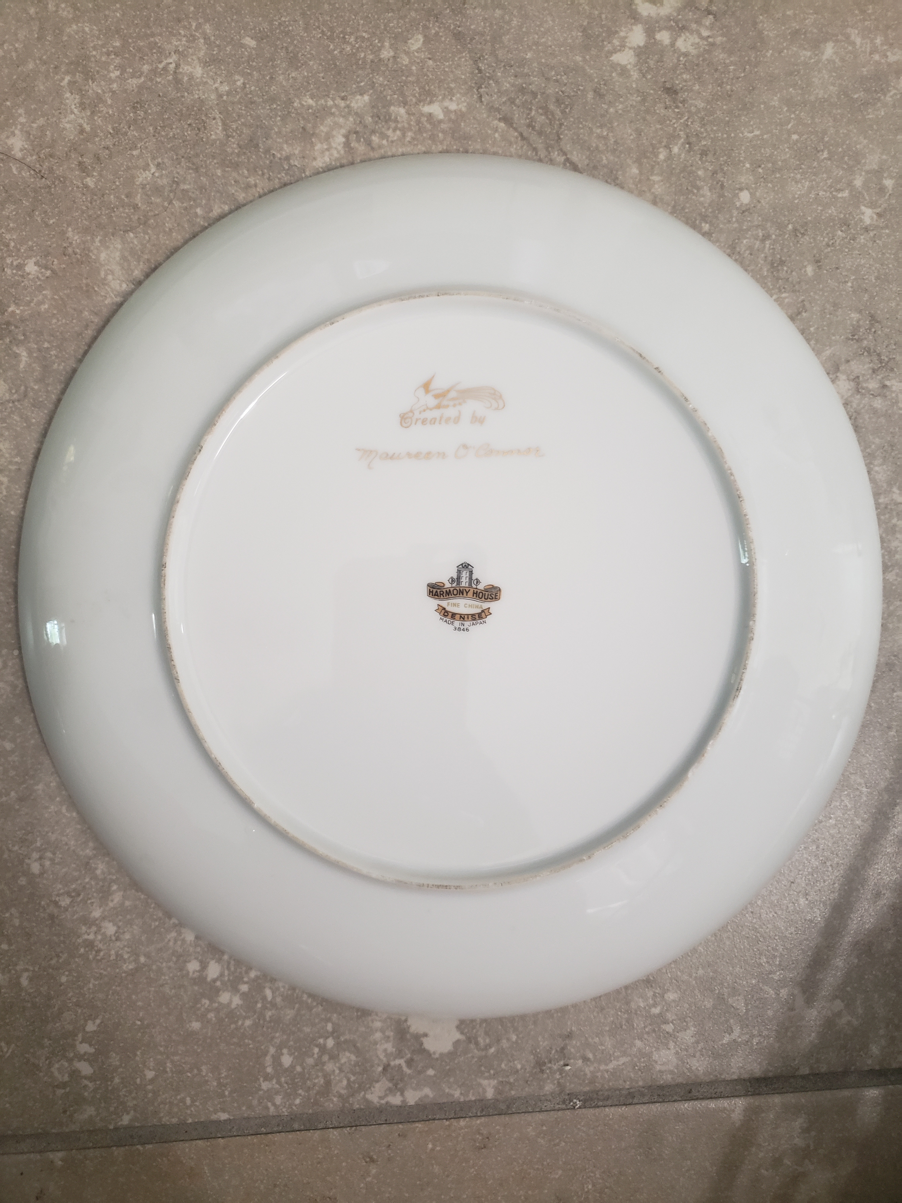 The dish shown is a 10-inch decorative plate from Harmony House, a private-label brand sold by Sears from the 1940s to the 1970s. It was manufactured in Japan, as indicated by the backstamp, and bears the pattern name “Denise” (3846)