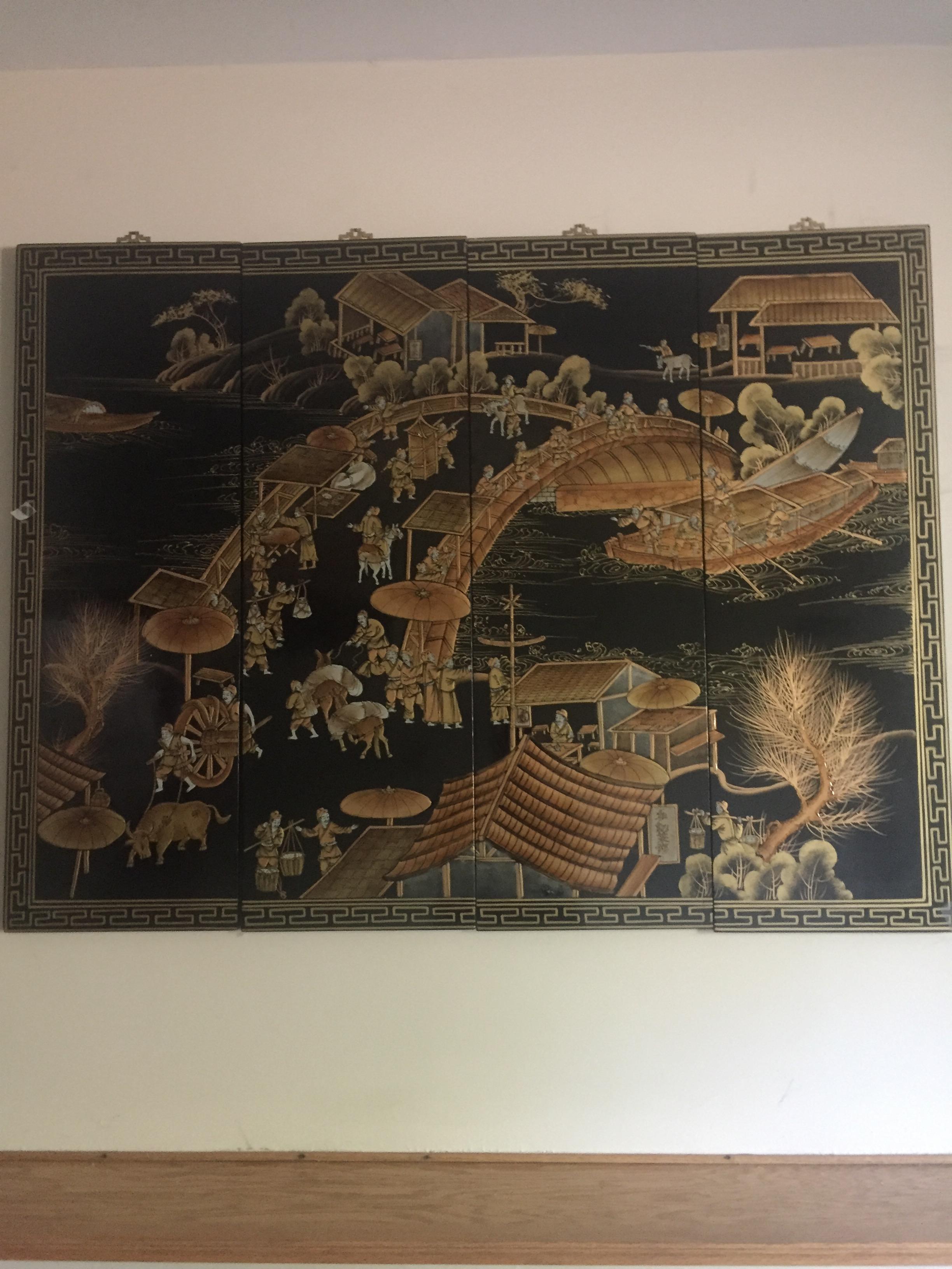 The Asian Art is in 4 pieces - each panel is 1 ft in length adn 3 ft tall.The detailed art is supposedly made with gold.