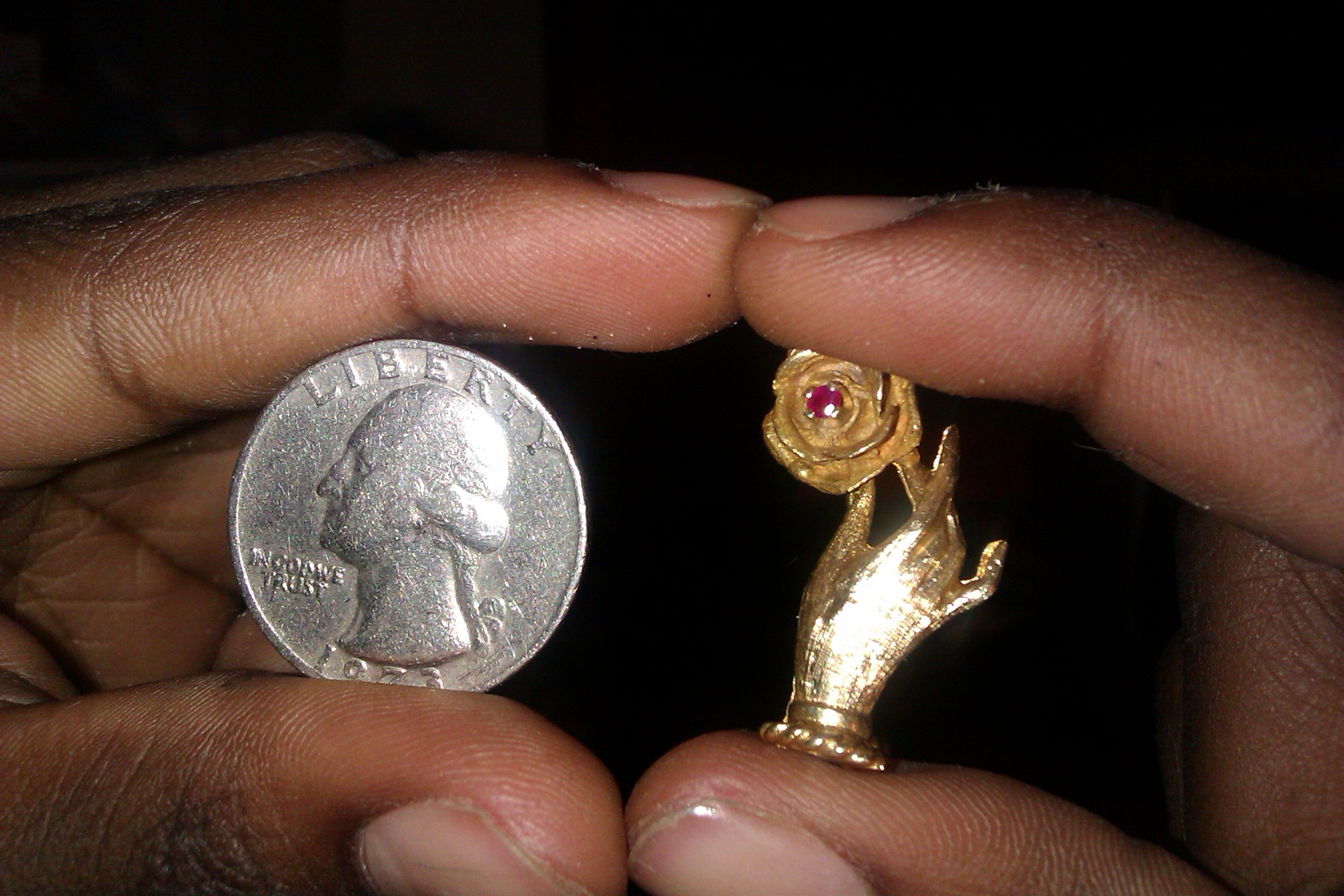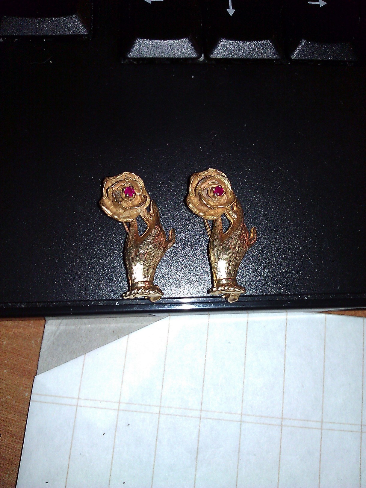 This set of Golden Hands pens was given to my grandmother by a local jewelry dealer/buyer here in Savannah, GA. It was passed to my mother.  The hands are stamped with 14k on the inside on the back.  Each hand is holding a rose and in the middle of the rose is a gem that looks like a ruby or garnet. All I know is that it's been around for over 30 years. We would like to get some legitimate appraisals for a potential sell of the hands.