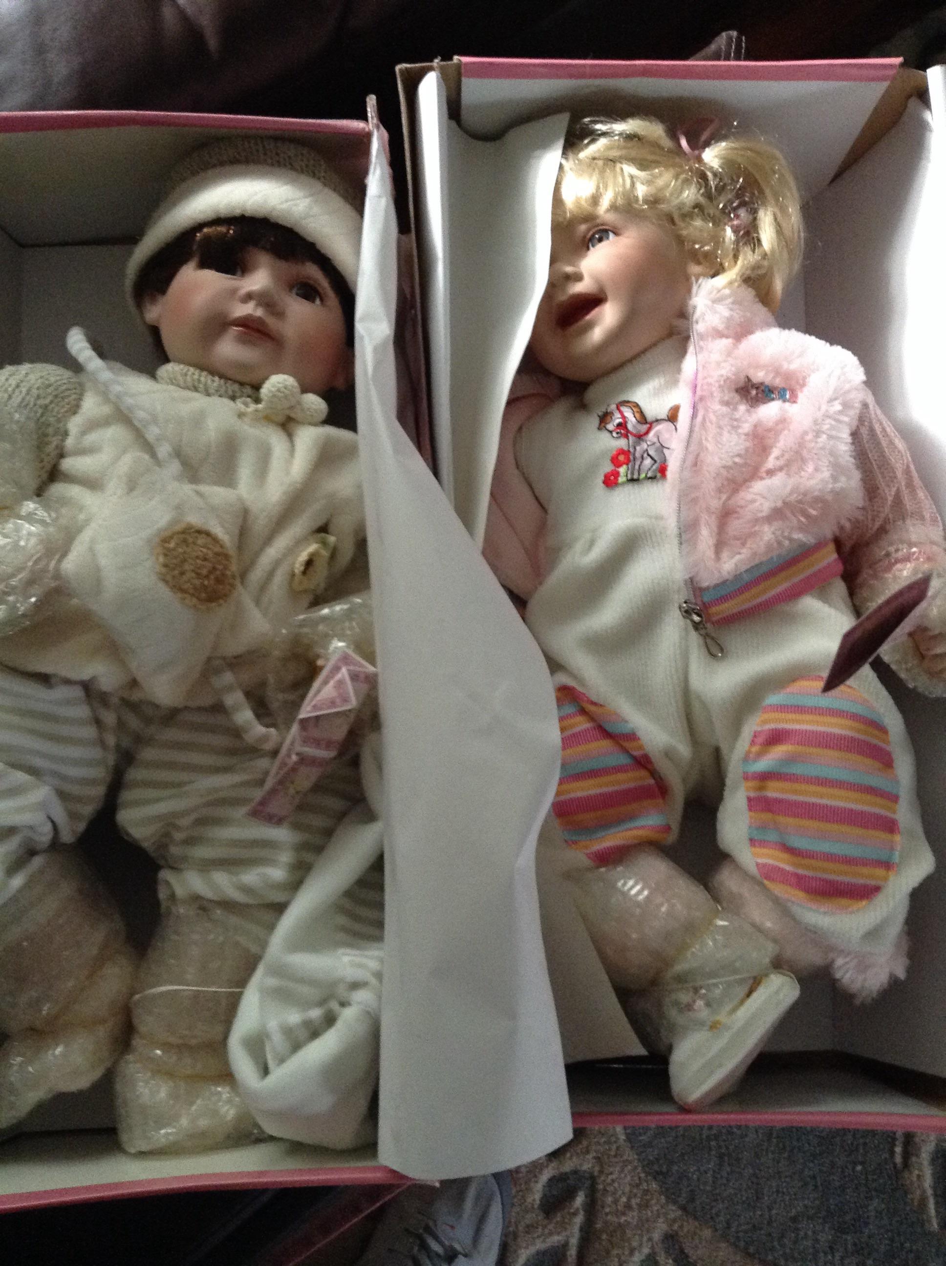 Two golden ware collection dolls. Both 1-3000 and are in packaging with certificates. Names are Victoria and Maria.