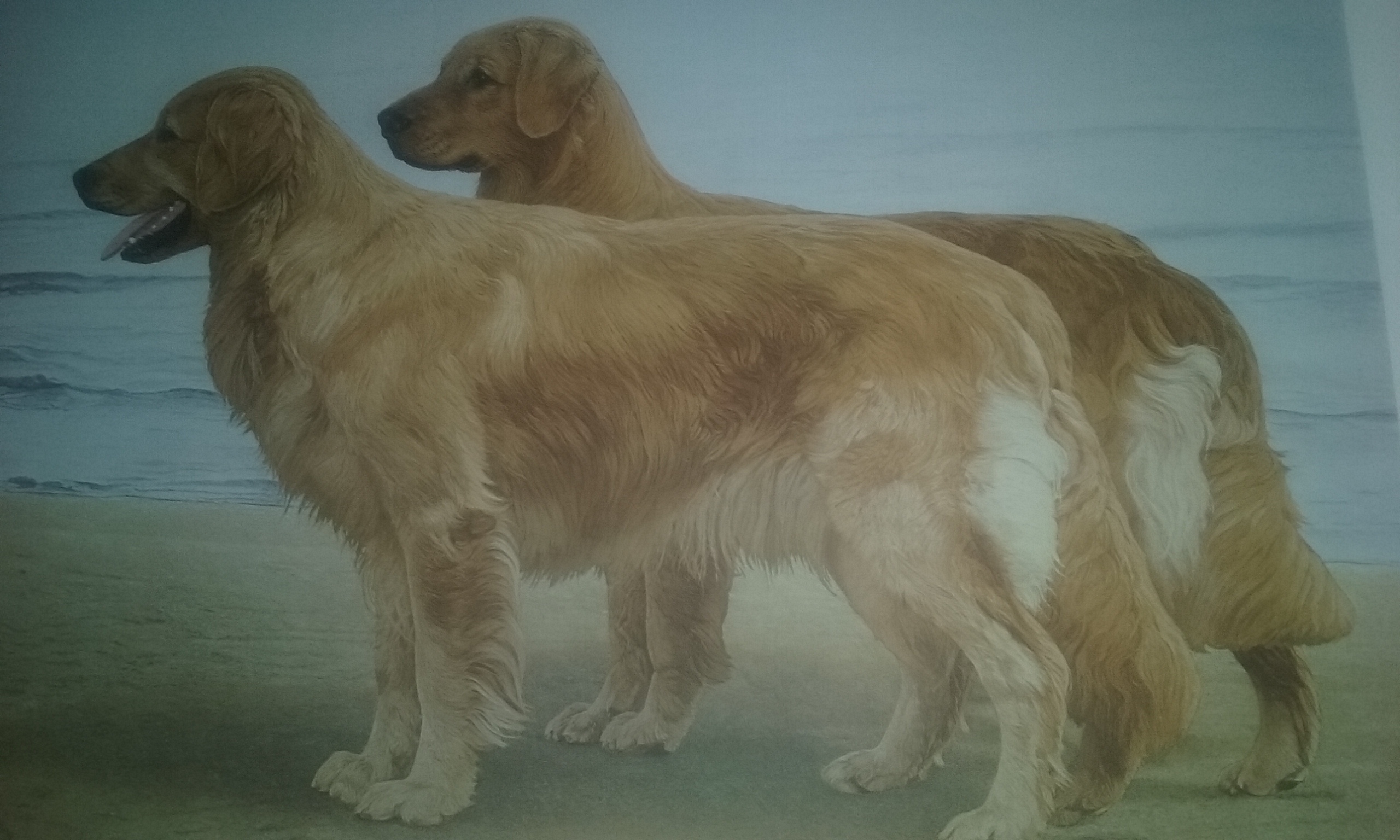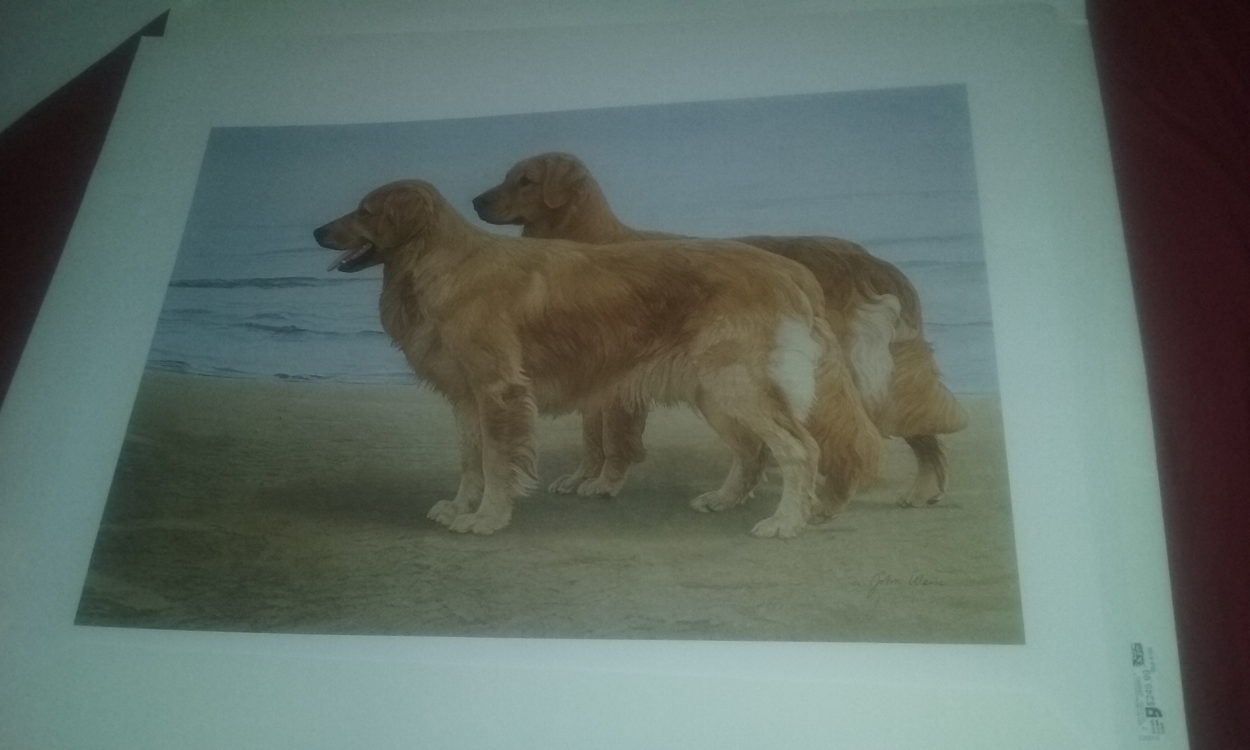 Painting by John Weiss, from Greenwich art studios of two Golden Retreivers standing at a shore line. They It is in pristine shape, brand new, and beautiful