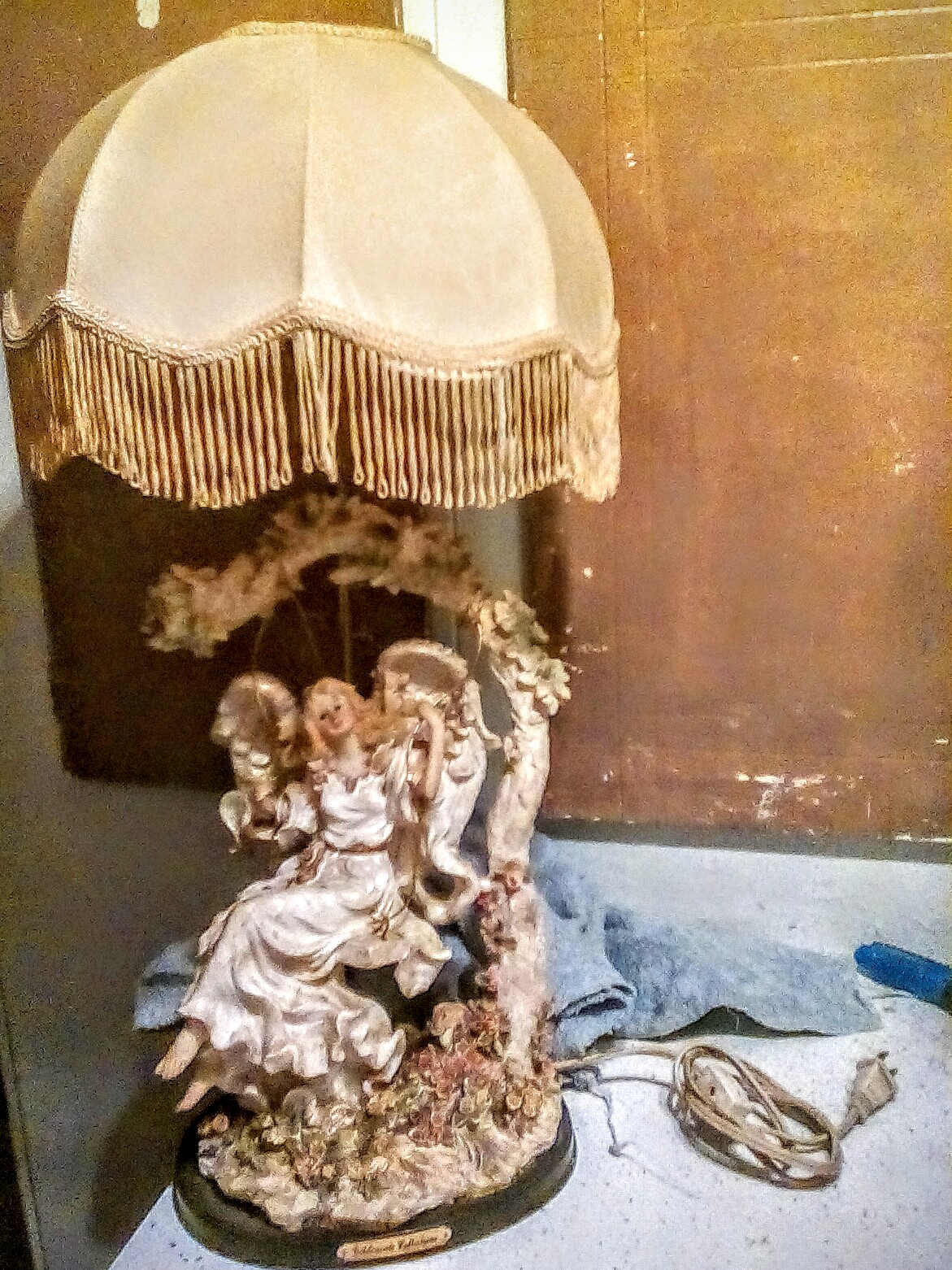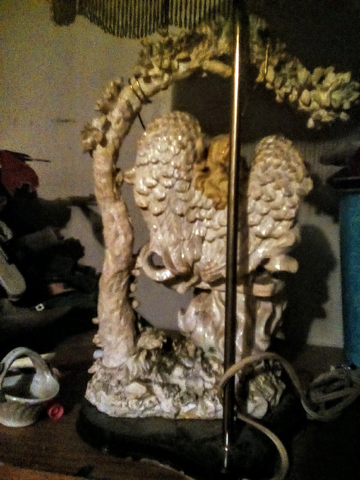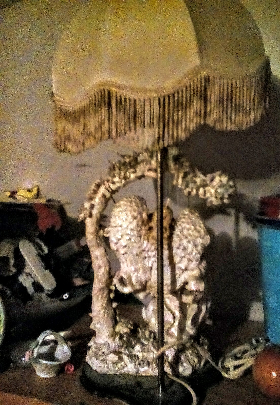 It is a beautiful angel lamp. Porcelain angel on a shimmery viney tree limb with climbing flowers and vines going up and leading down to a sort of homemade garden swing she is sitting on,. Then has a pole coming up the backside of her and above to make the lamp , and a beautiful white fringed shade over top the lamp! Very elegant,cannot find her online ANYWHERE and only found 1 something similar at all! Love to know how rare and old, she is and maybe a price estimate to