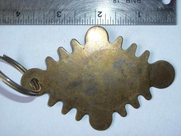 4 inches by 2.5 inches. Appears to be all brass. Inscribed on fob is: