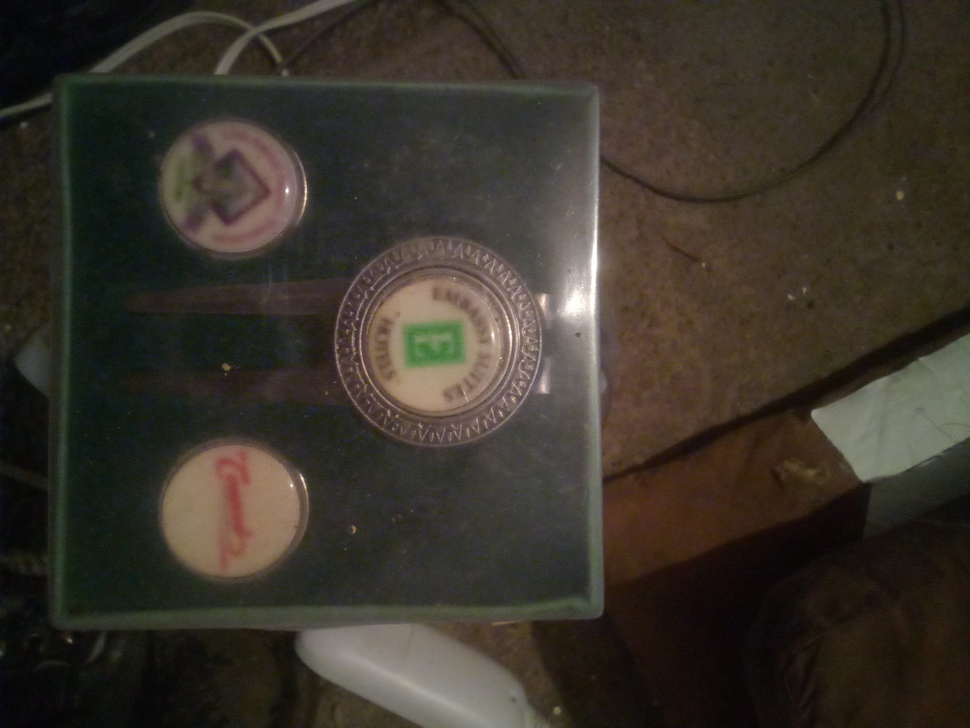 Physical Description: This set of golf pins features three distinct pieces, each made from metal and some combination of plastic or enamel. The dimensions of the pins are approximately 2.5 inches by 2.5 inches, with a total weight of 15 grams. The pins are housed in a protective box, which adds to their appeal as a collectible item.