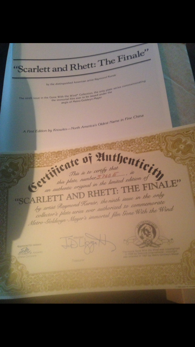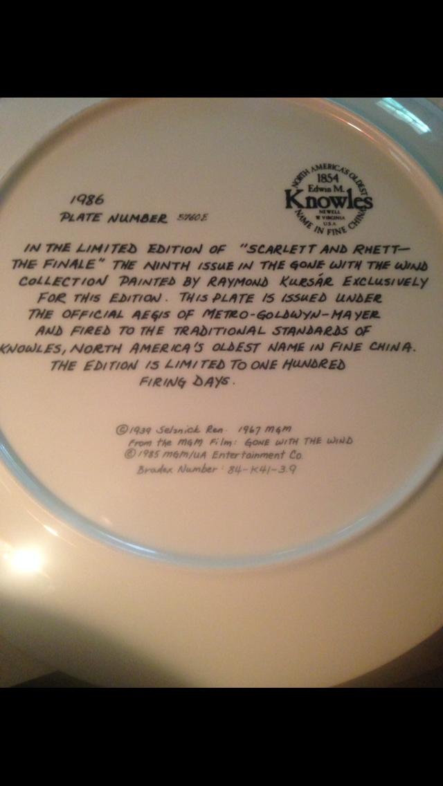 Edwin m knowles gone with the wind decorative plate. Plate number 5760e. Scarlett and Rhett the finale the 9th issue in the collection painted by Raymond kusar