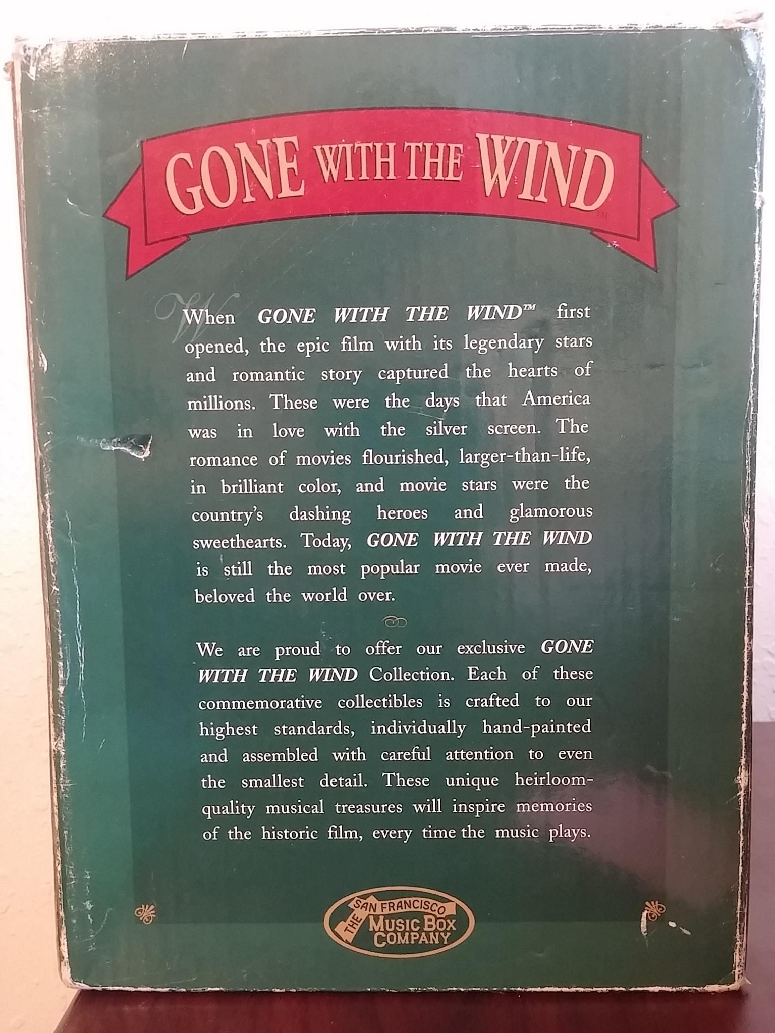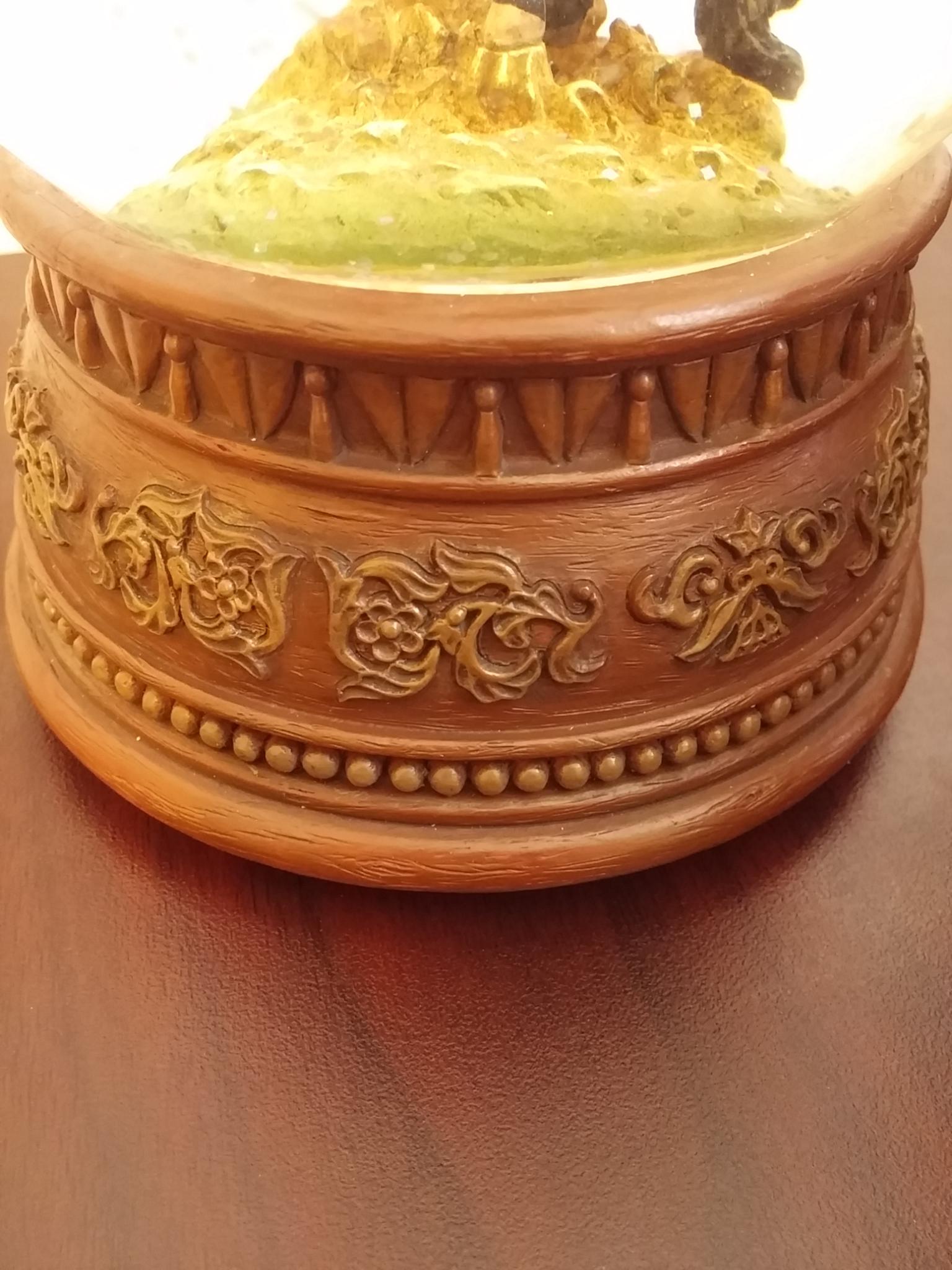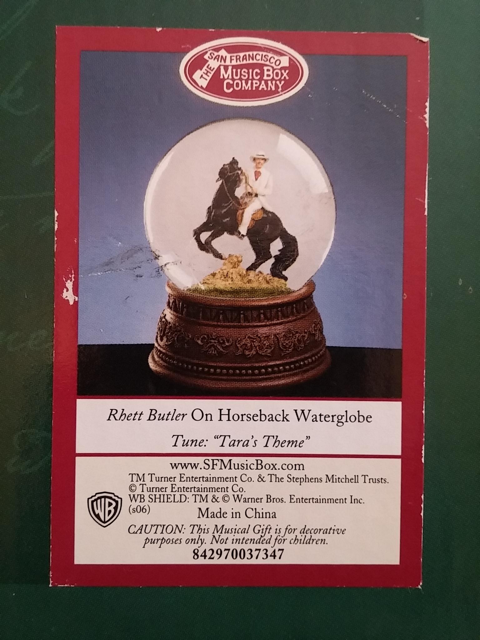 I have a San Francisco Music Box Company Gone With The Wind Rhett Butler On Horseback Waterglobe and was curious to it's value, if any. The Tune is 'Tara's Theme'. It measures approximately 4.75" W x 6.5" H . It does have a water bubble about the size of a dime. The water is clear but kinda looks like it has a tint because of the base color reflecting.
