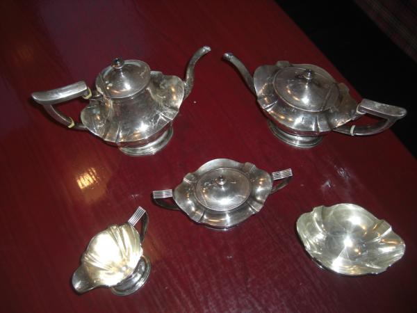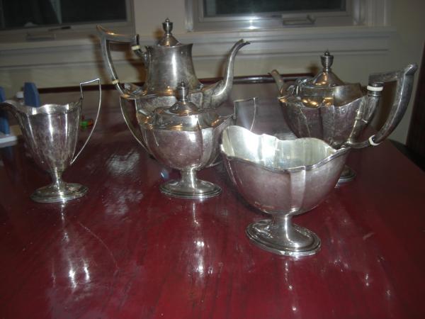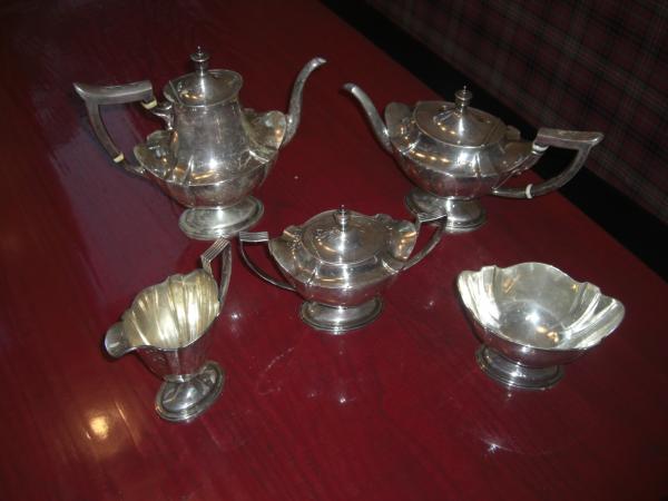 Set comes with: Tea Pot, Coffee Pot, Sugar bowl (with lid), Creamer jug, and Waste bowl. In good condition. tarnishes have been removed and the silver has been polished.