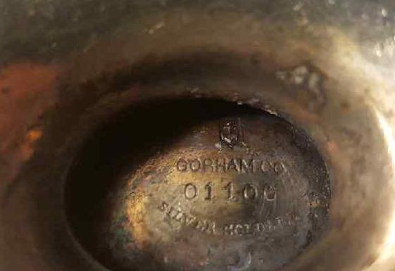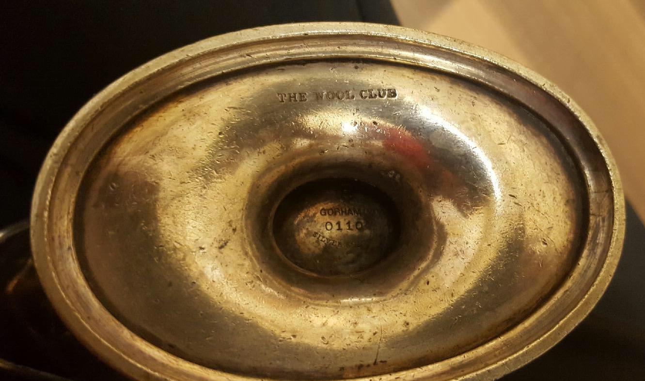 Made by Gorham and engraved with "The Wool club" and the code is 0110 on bottom. About 8" wide with handle and and about 4" tall.