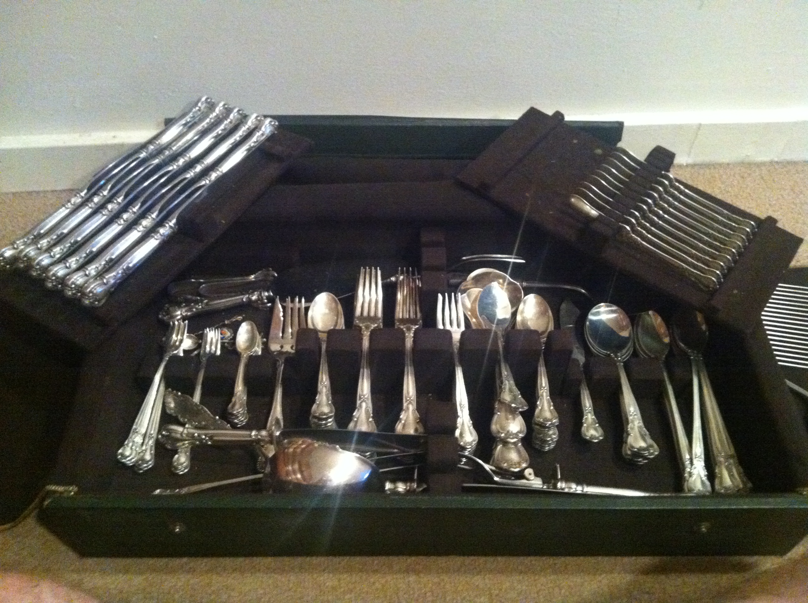 1 Large serving spoon (This one doesn’t appear to be a Chantilly design, but it is Gorham Sterling, the Luxembourg design, I believe. I’ve attached a closeup photo of the markings, it is the one with a “T” in a diamond, “PAT. 1893) and the Gorham markers (Lion, Anchor, G), stacked above the word “STERLING”. It is also monogrammed with “JJK”, not “M” as are most of the other pieces)