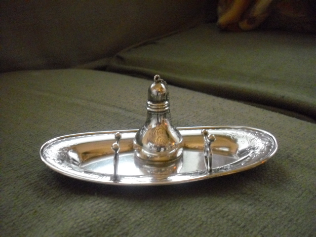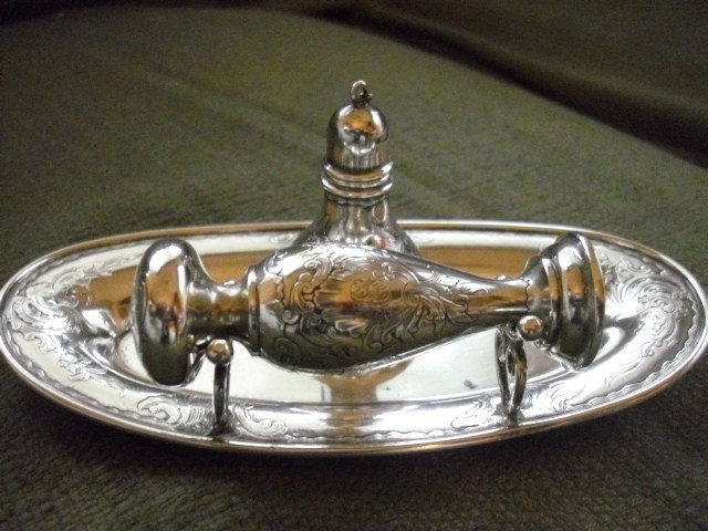 This piece is a family heirloom, passed from either grand or great grand-parents. It is hallmarked Gorham on the bottom of tray, lion, anchor and G, sterling, B507. The design is floral, maybe lilies and vines? on all 3 pieces. The alcohol burner is attached to the base of the tray. Monogrammed with initials left to right-H.E.S. Possibly my great, great grandmother, In our book of Geneology written by my great grandfather, the only one with those initials is Harriet Edith Slack, born 1861-1953. The seal shaft , the tip and the alcohol burner are all monogrammed.