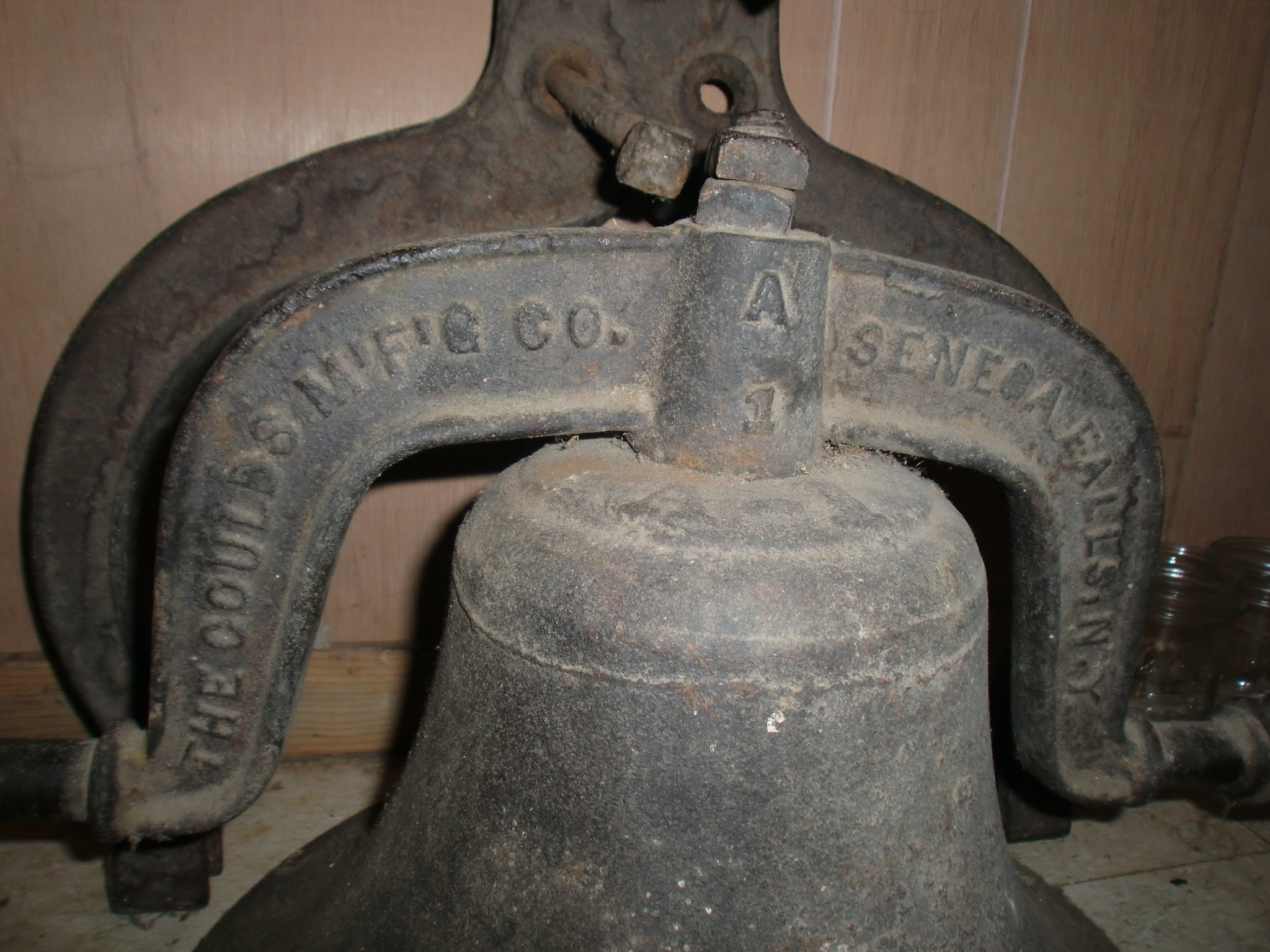 15" cast iron farm bell with yoke, post mount cradle, and clapper. Pre 1890. Raised lettering on yoke reads as "The Goulds Mfg Co. A-1 Seneca Falls NY"  approx. weight 40lbs total.   Looking for appraisal.