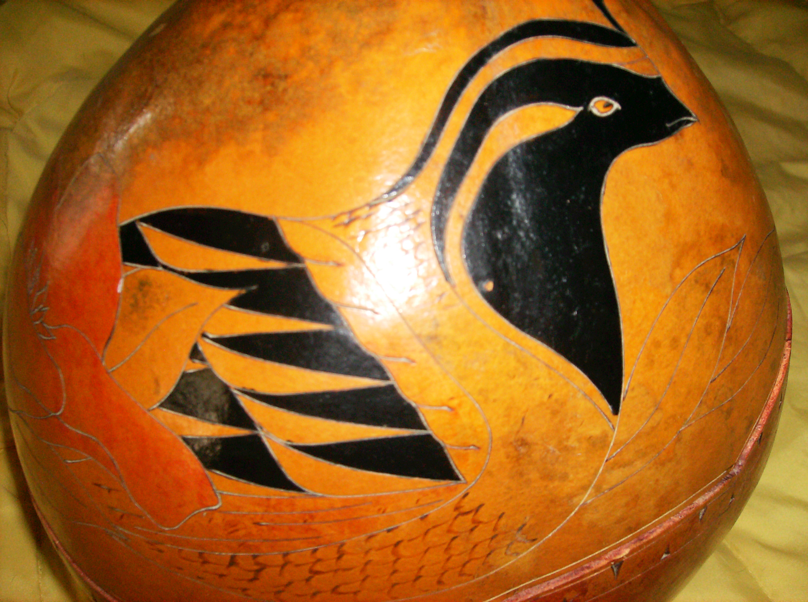 This is a hand-painted gourd that is a container.