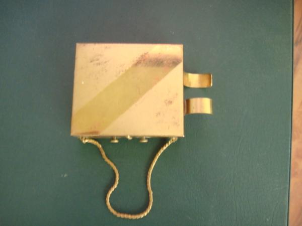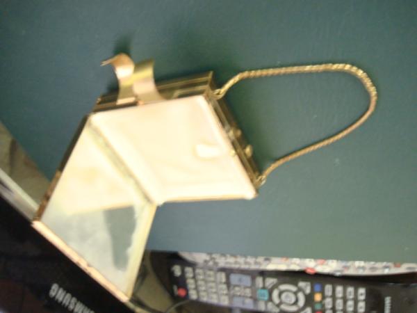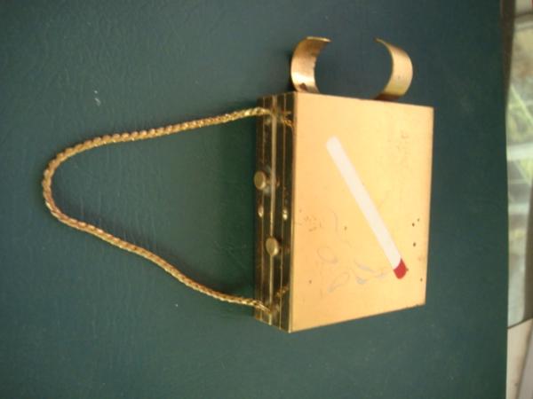Gold colored case with pic of cigarette burning on front. Has chain to carry like little purse. Non-filter cig compartment, also powder/mirror comp. and side lipstick slide in. Opens like abook with seperate openers on each side.
