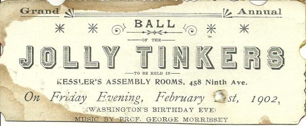 I found this ticket inside an old upright piano manufactured in the late 1800's. Ball of the Jolly Tinkers was held in Kessler's Assembly Rooms, 458 Ninth Ave. I'm assuming that is in New York but I am not positive. Music by Prof. George Morrissey. The only information is on the ticket itself and I have had no luck with online searches. The cool part are the initials on the back of the ticket and the fact that the user had the ticket punched. There is some discoloration due to being inside a piano for 108 years. It may be slight water damage.