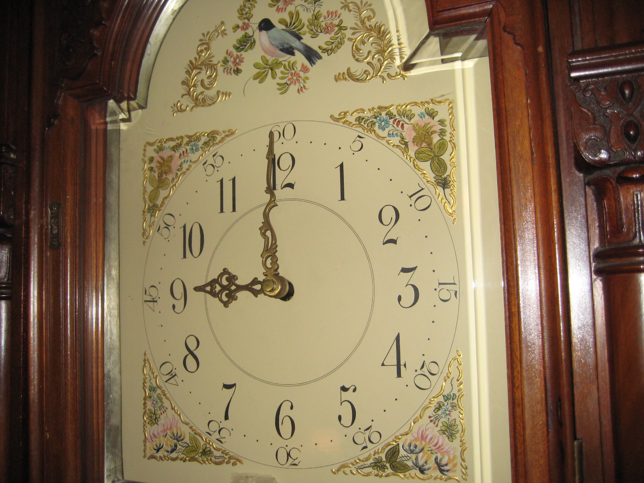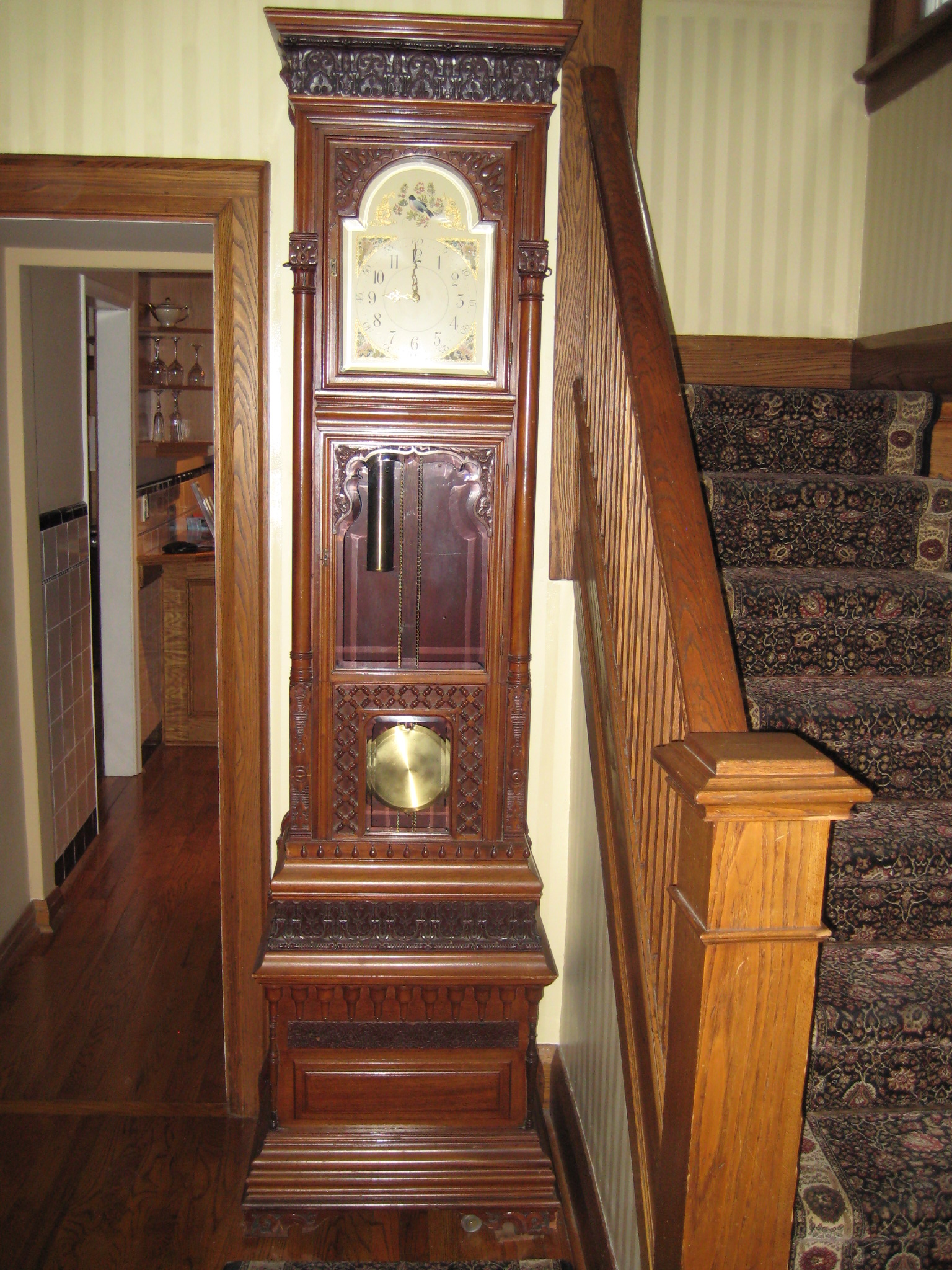 No visable markings of manufacture. Large clock, approx, 7 feet tall, bevelled glass and nicely carved. I would like to know its value. It works well with a wonderful tone, but is very finicky, and stops easily. Has been worked on to some very impressed repair persons