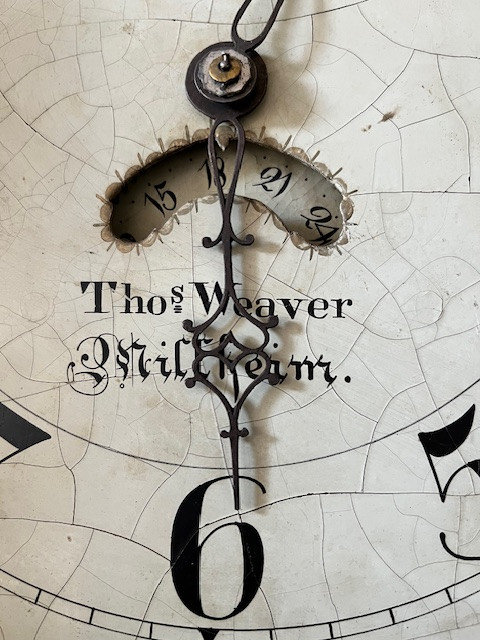 Your tall case clock, or "grandfather clock," appears to be an early 19th-century English longcase clock with a hand-painted dial signed by Thos. (Thomas) Weaver of Milham (likely a reference to Milham, England). Based on the floral decoration, Arabic numerals, moon phase aperture, and case style, here's a detailed report: