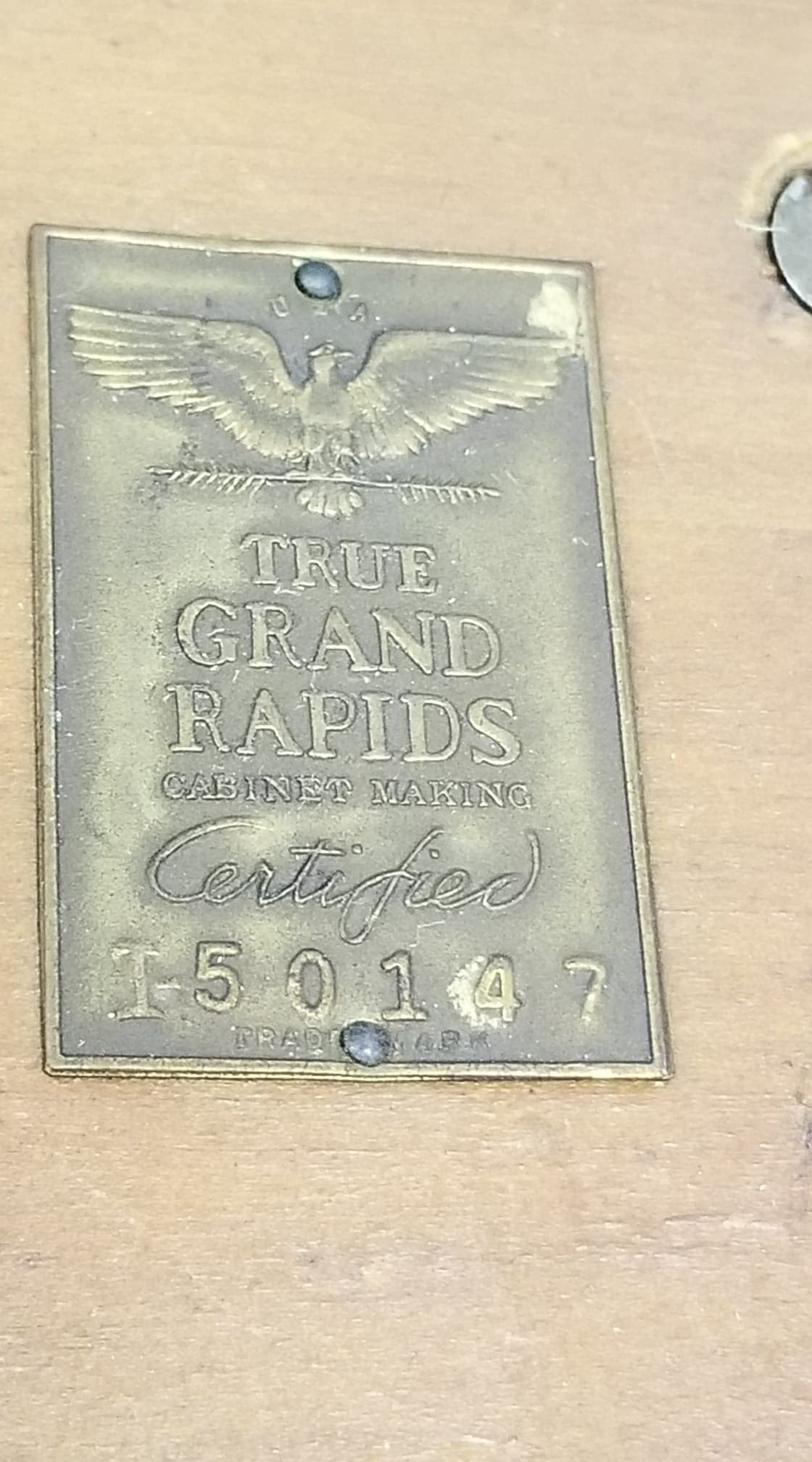 "The brass tag is the mark of a local trade association known as the Grand Rapids Furniture Makers Guild. The Grand Rapids Furniture Makers Guild was formed in 1931 to cooperatively market Grand Rapids products during the Depression. According to the book "Grand Rapids Furniture - The Story of America's Furniture City" by Christian Carron, published by the Public Museum of Grand Rapids, virtually every piece of furniture sold by a Guild dealer was registered by a number and marked with a special tag identifying it as "Guild Certified" and often had no other identification. Each tag was individually numbered--in fact they made a big deal about this in their ads--but the records of what those serial numbers meant or to which company they were assigned has been lost."