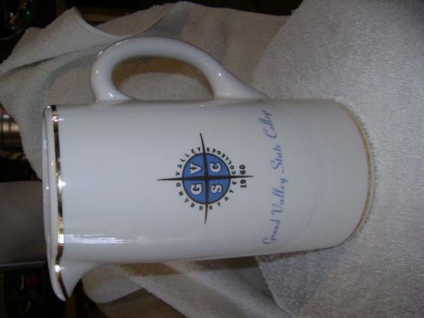 I have a ceramic (I believe) pitcher with the logo from Grand Valley State College on it. It has gold trim around the top and bottom edges. It also has etched into the bottom " Amercian Decorators Trenton 10 NJ". Looks to be before 1987 because the College changed its name to Grand Valley State University in 1987. If anyone can give me an approximate value, that would be wonderful.