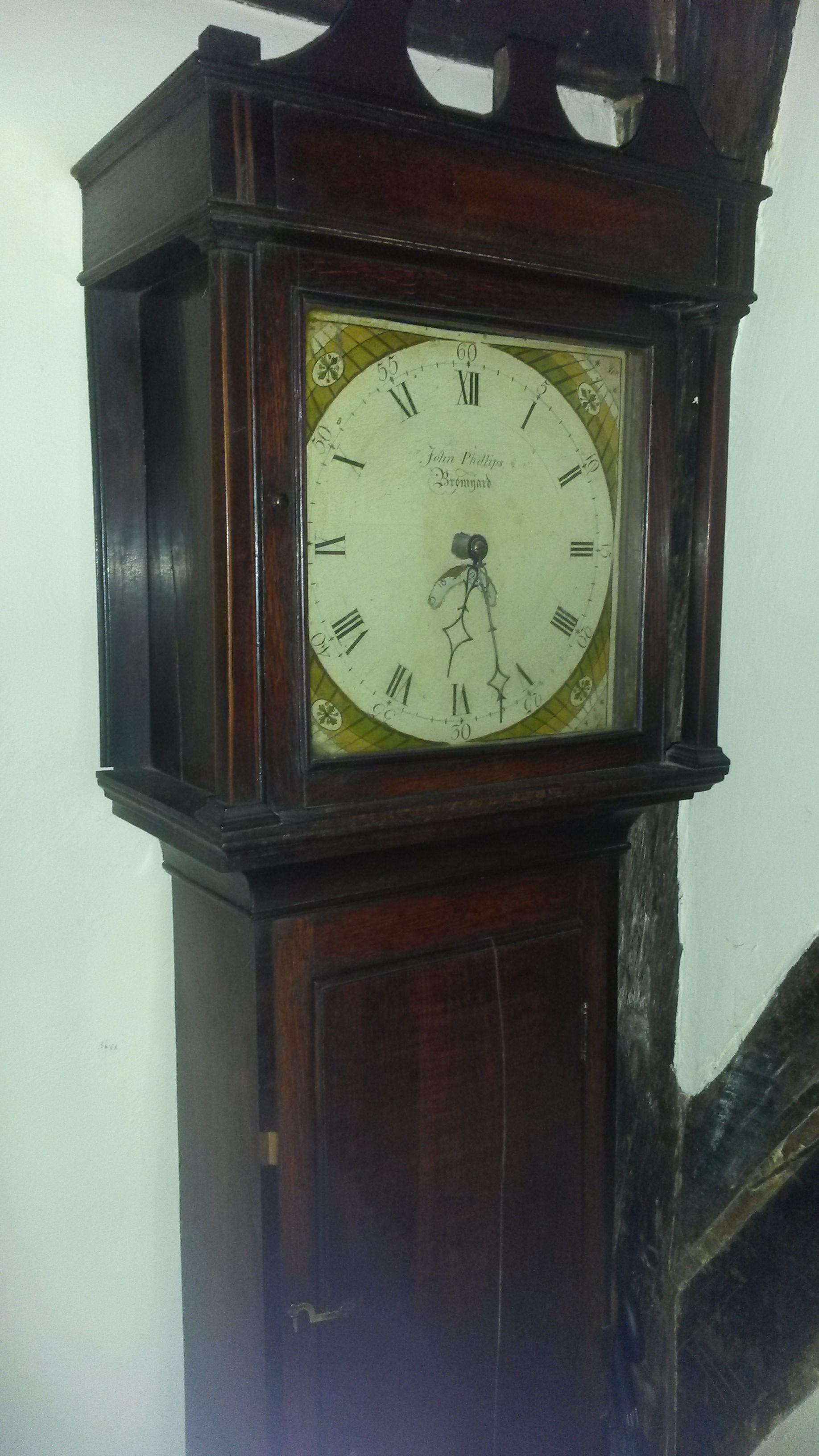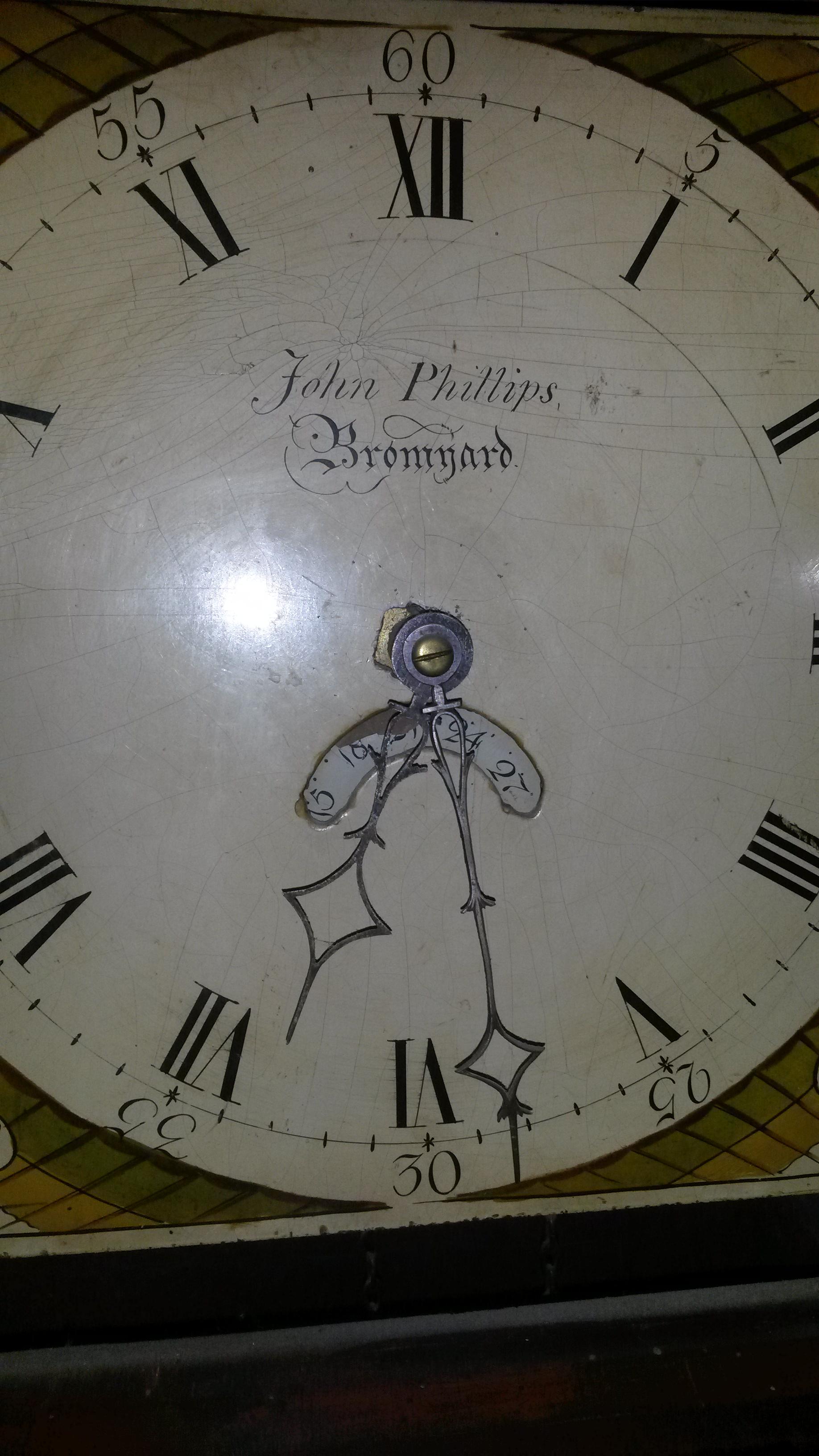 Wooden oak grandfather clock. John Phillips Bromyard. Belived to be 1797. Seconds dile and bells on the hour. Not in working condition. We have had the clock in my family for over 50 years and have just been inherited by me. looking to get the clock back to its working condition if possible. Would like to know the history of the clock.any value it has and how to get it repaired.