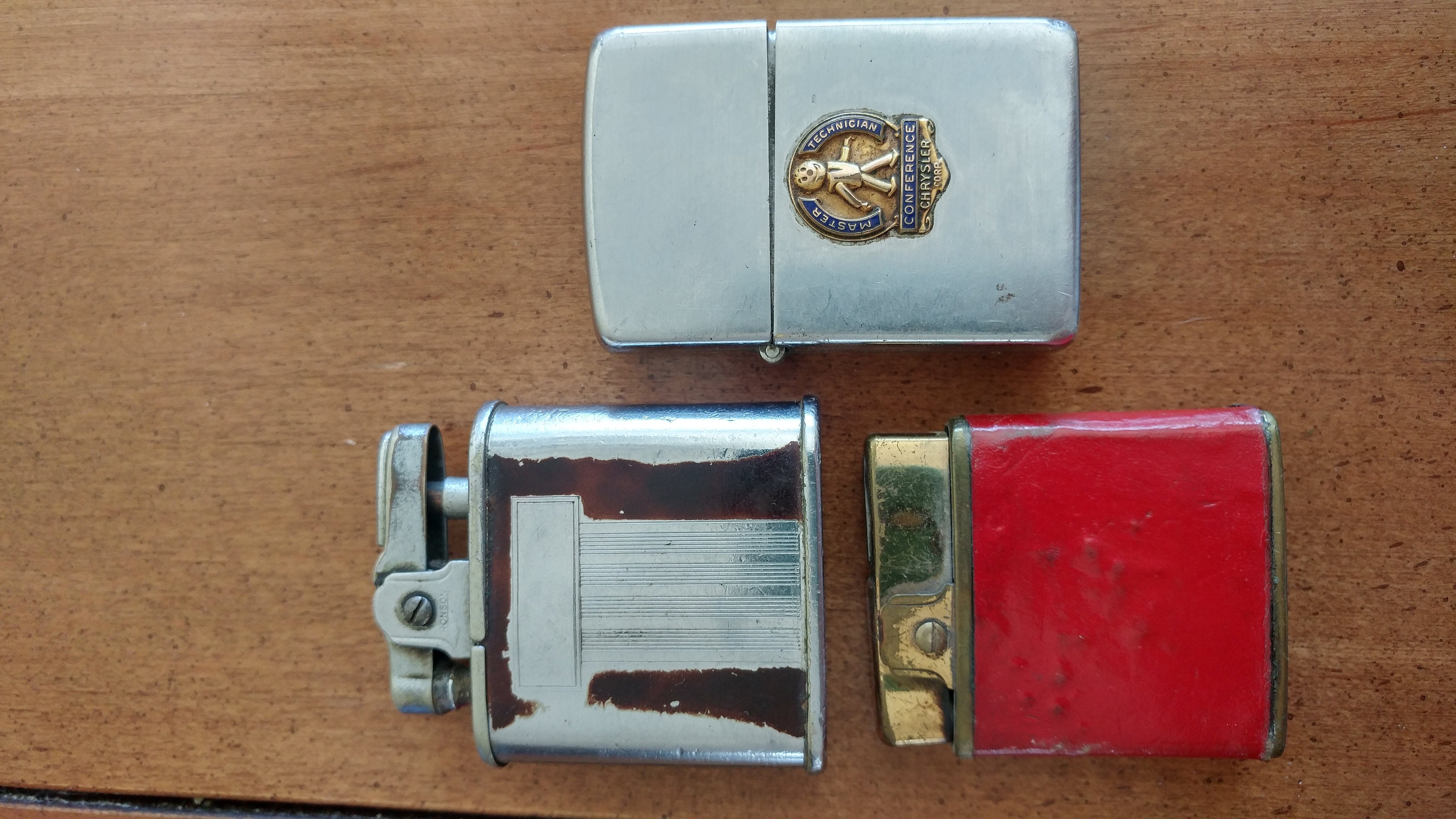 the zippo is silver and has a master technician conference chrysler corp. logo on it. the pat. number is 20326S5. the ronson "whirlwind" is silver and has a small flip top that looks like it has a wick sticking out. i think you have to put flint in it. the pat. number is re.19.0232.481.195. the prince gardner is red and gold. it also has a small flip top that has a wick and you have to put flint in it as well. the pat. number is 122139. just wanted to know what they are worth.