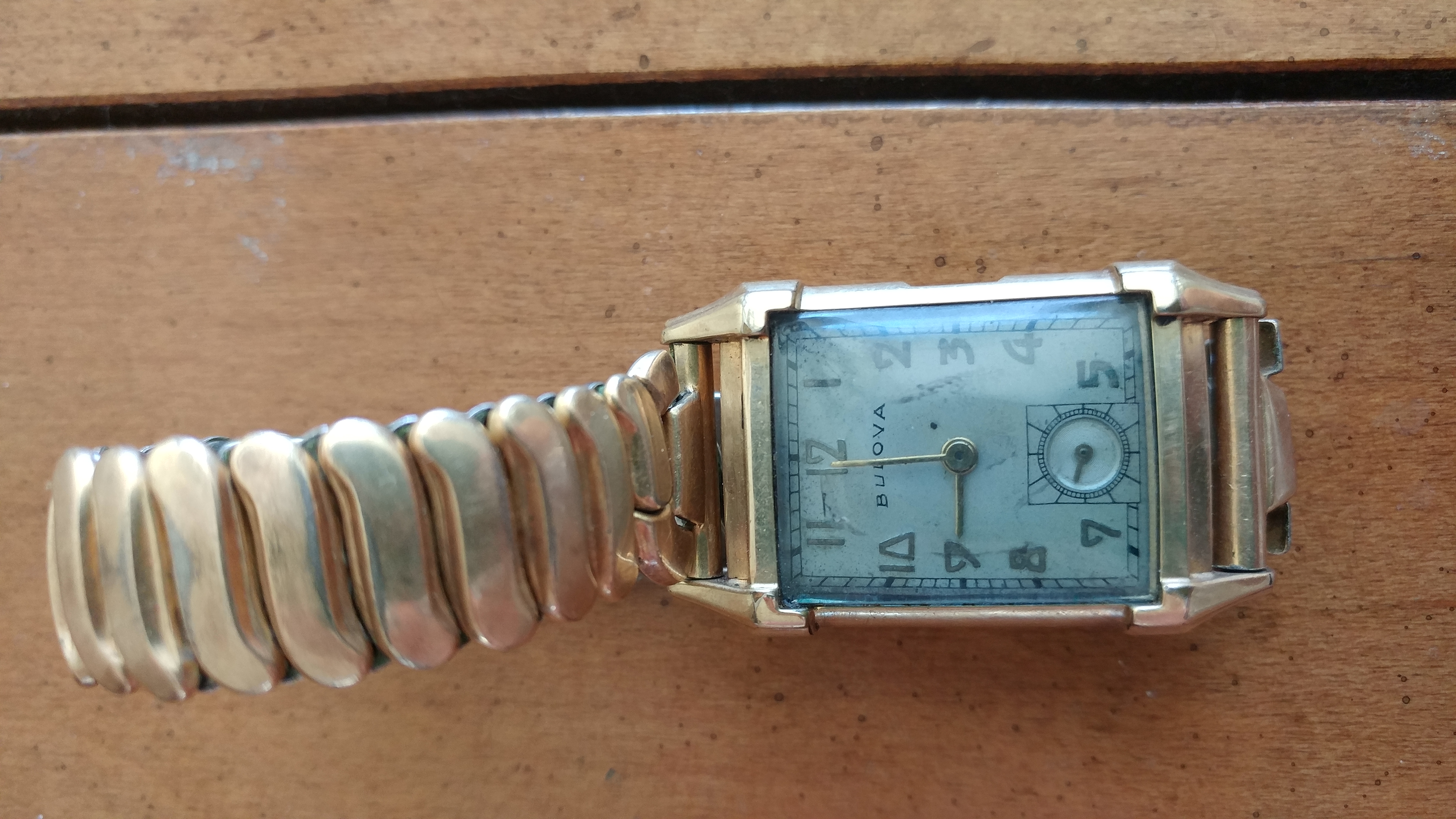 the watch is gold with a light blue cover on the rectangular face. there are some numbers on the back: 025217 and it also says 10k gold filled, bulova, 48. i was curious how much this could be worth.