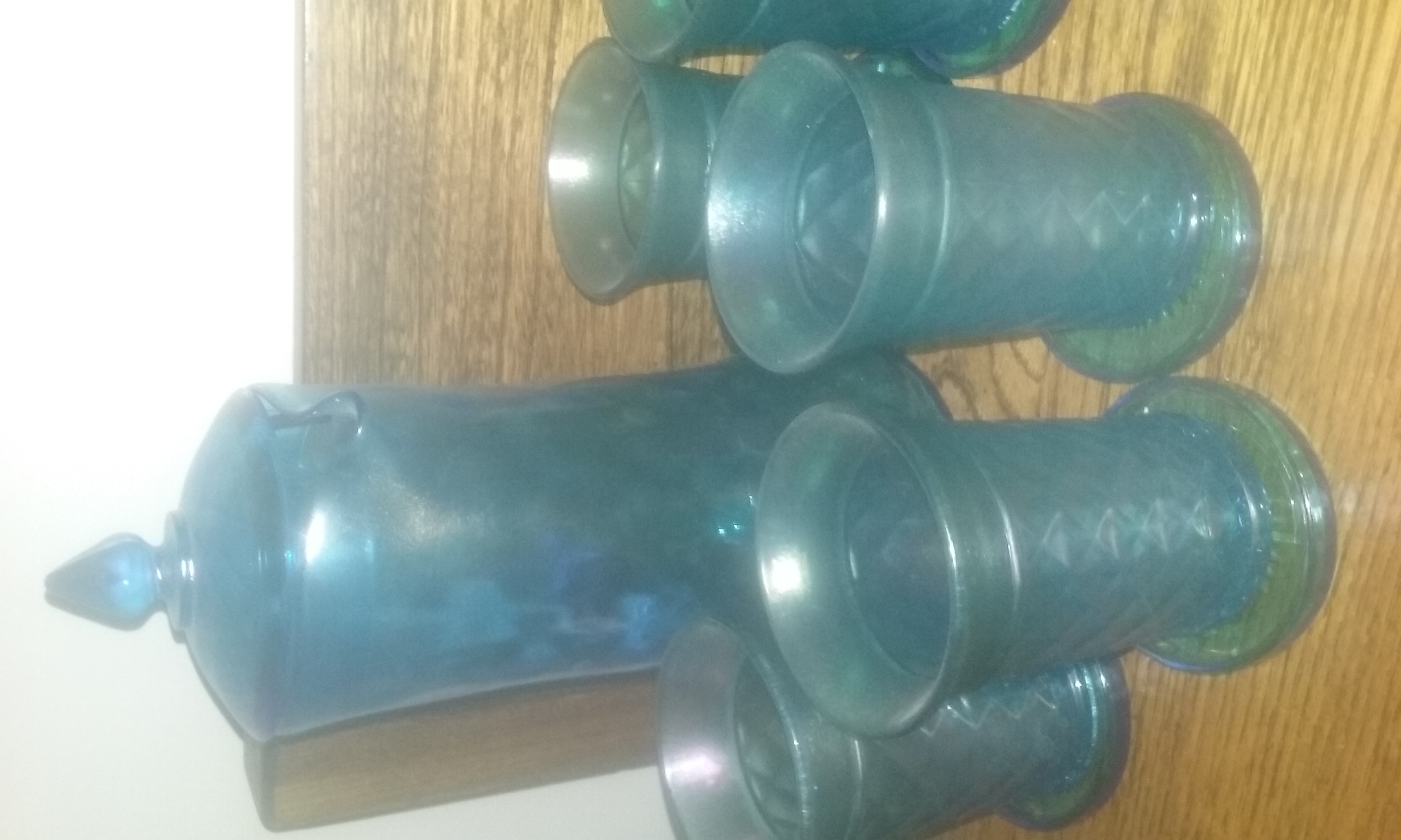has a late 60s or 70s look and i would guess about 20 for the pitcher and 2-3$ a glass. if the lid and pitcher are not chipped. the look is really mid 70s because of the color it is similar to the wheaton bottle produced around that time.