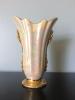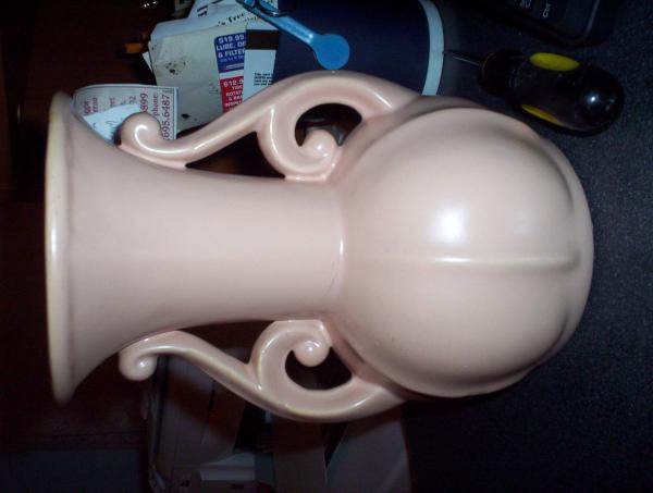 Vase is pink/peach color. Rounded bottom section has 3 raised lines in front and in back. The upper section of the vase is fluted and has raised lines corresponding to the lines on the bottom section. 2 handles (one on each side)each consist of a base (kind of diamond shaped) branching into 2 sections. The bottom section of the handle curves in at the top of the bottom section of the vase and ends in a ball. The upper section of the handle joins the upper section of the vase about 1" from the lip of the vase and curves away in a ball shape. "RUMRiLL" and "H-12" are etched - not stamped- on the base. (Appears to be hand written.)Flat (ie. not shiny) glaze on all surfaces except rim on base. No apparent cracks or scratches. ("Good" condition?)