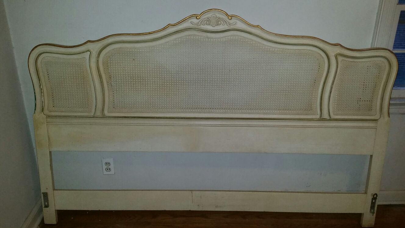 There is a headboard, a mirror, a long low bureau, and a tall bureau. See pics.
