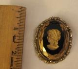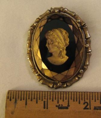 cameo is carved down into the piece, not raised.  approx max depth is 1/8 inch.  gold is worn from the top needs a good cleaning and has a few other issues.  has a pin attachment and pendant attachment.