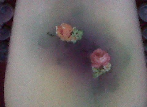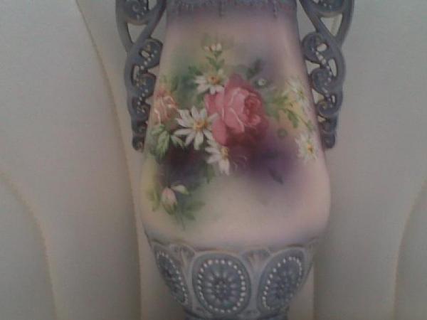 bluish-gray with lilac tones top and bottom;center has arrangement of flowers - daisies and roses; on the back it has a one peach and one pink rose; ornate handle on either side