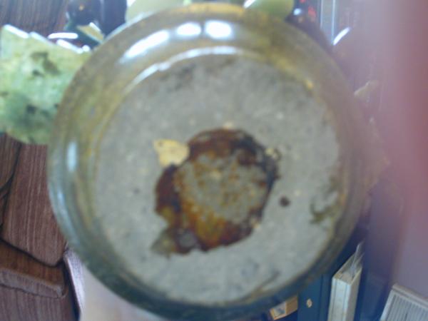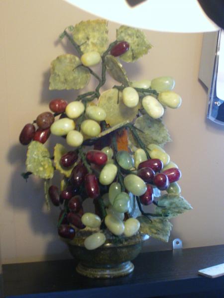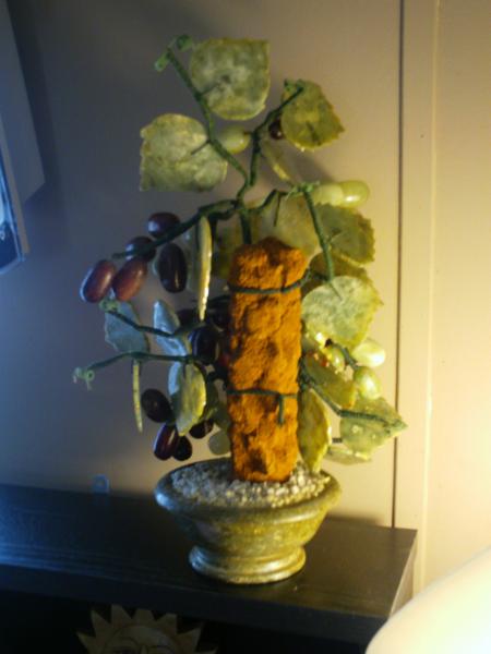 I received this about 7 yrs ago after it had been sitting in an attic for 40+ yrs. It is very beautiful in the sunlight. The leaves appear as the color goes all the way through when you look at it through natural light. There was something on the bottom of the pot at one time and I have tried to find some marking on this piece and can't find anything. I'm not even sure what you call this or what it is made from.