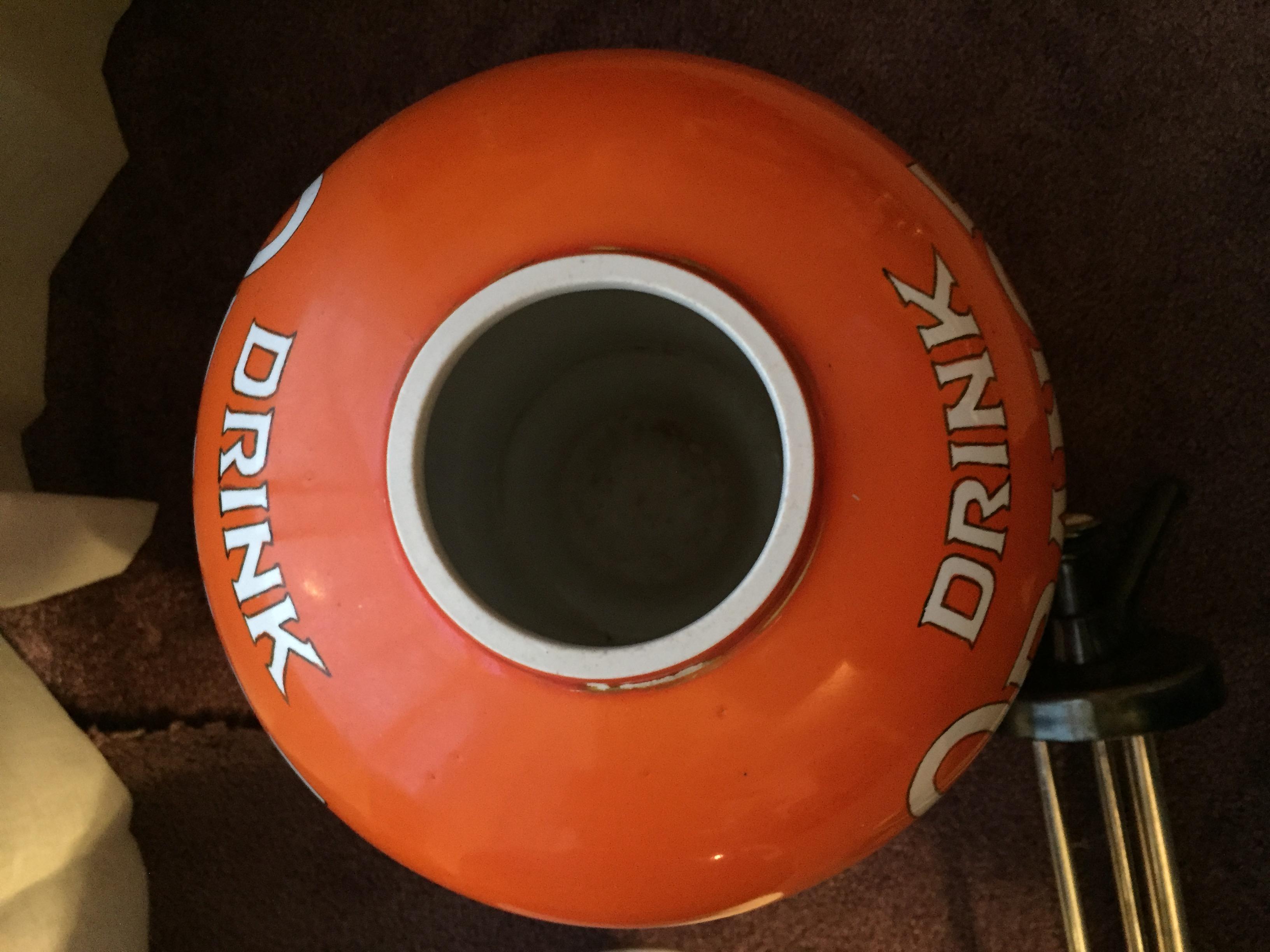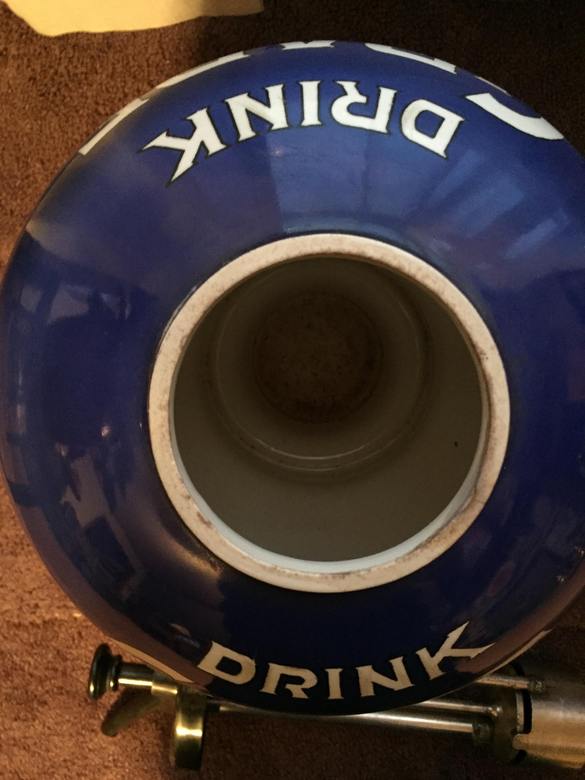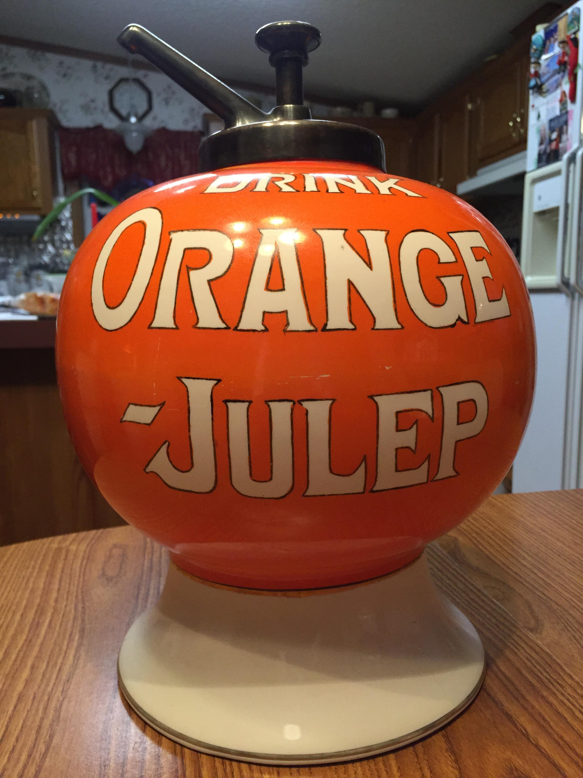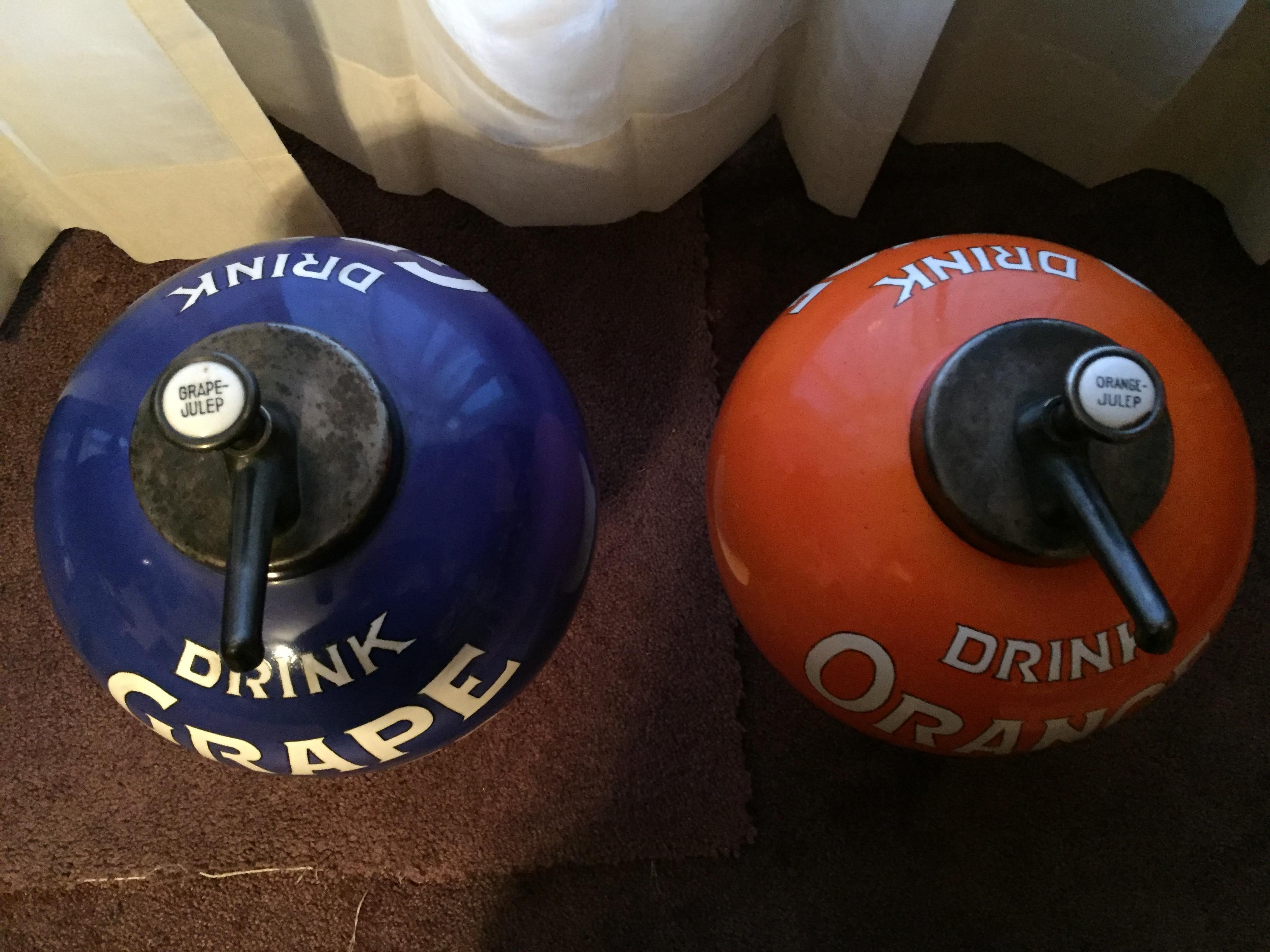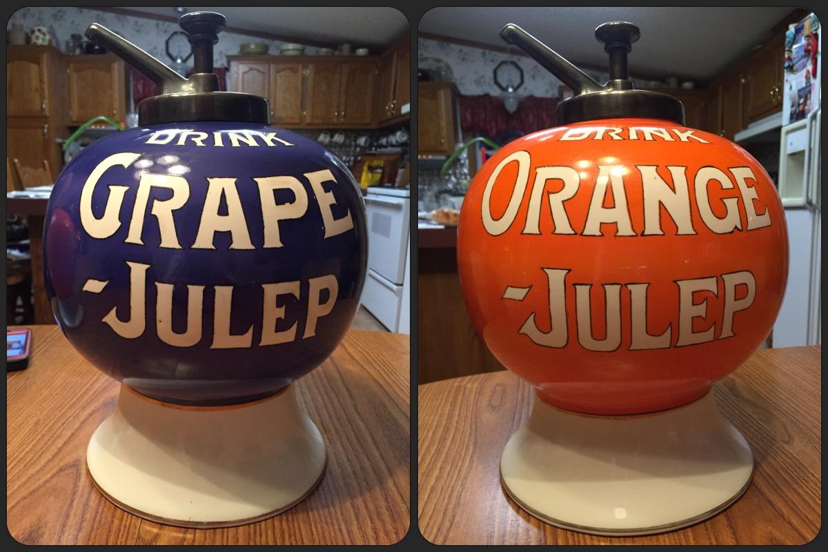 My parents have owned these syrup dispensers for well over 50 years. They came out of a shoe repair store in New York. The colors are very vibrant and their condition is quite good. The gold trim is not worn and they have no chips.