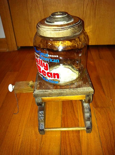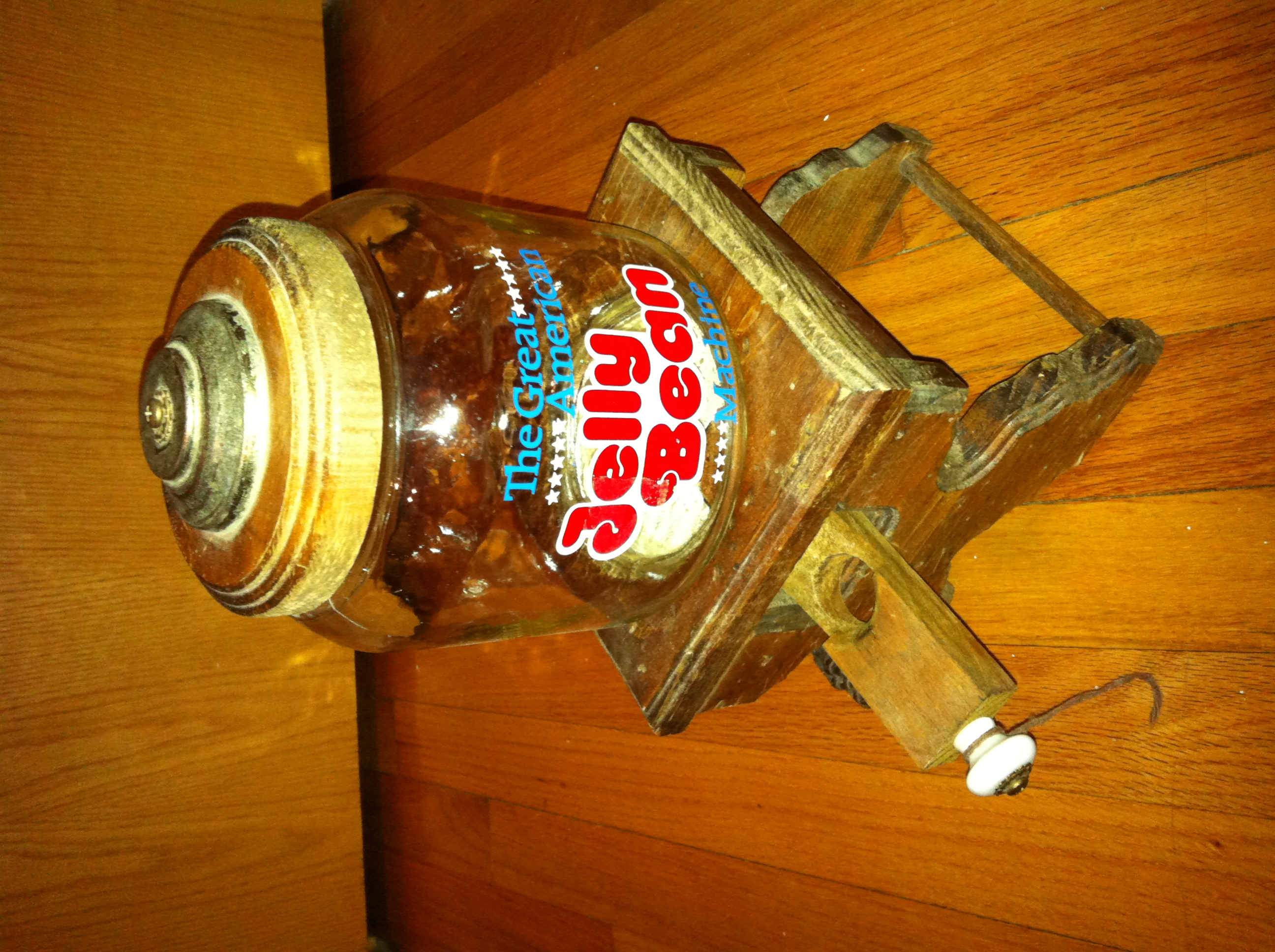 the great american jelly belly machine the base and top is made out of wood with a glass candy holder.