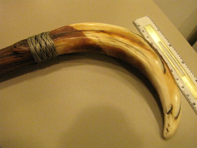 Looks to be an old large wild boar tusk handle attached to a nice hardwood base by a woven coin silver collar. Quite desire able to some. The rubber stopper on the bottom was added later and it should most likely come off, don't force it if firmly attached. I do not know the extent that affects the value. A nice original cane in this style generally brings $200-400 at auction.