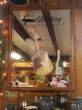 Great Western Champagne 3D mirror, has an image of a lady sitting on a cork next to a champagne bottle. I am not sure about any other information on the mirror. I am hoping someone else can tell me about it. It seems sort of rare