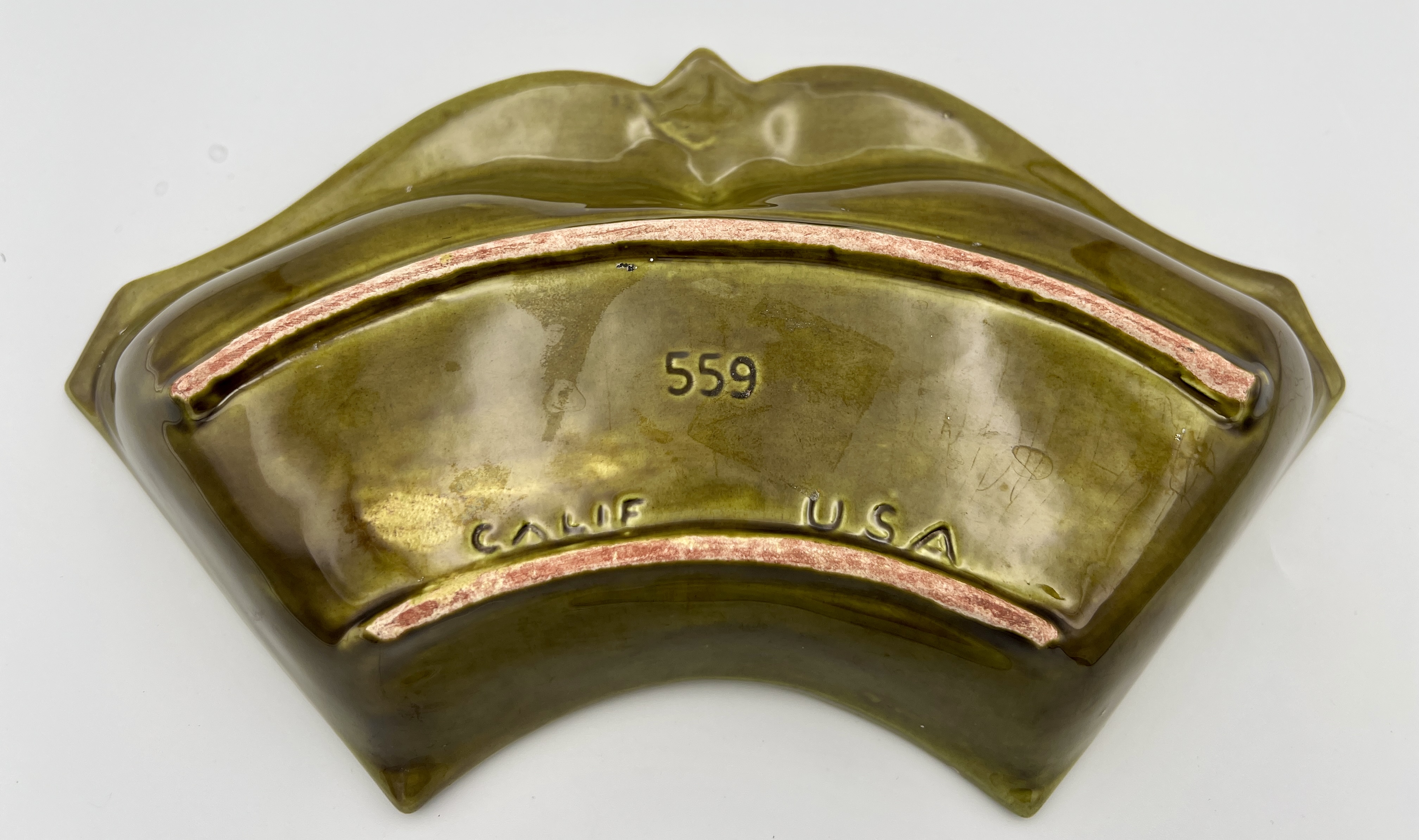 Historical Context: This tray is likely from the mid-20th century, a period known for its innovative designs and vibrant colors in pottery. The '559 Calif USA' mark suggests it was produced in California, a hub for ceramics during this era. Many California potteries embraced the Art Deco style, which emphasized geometric forms and bold colors.