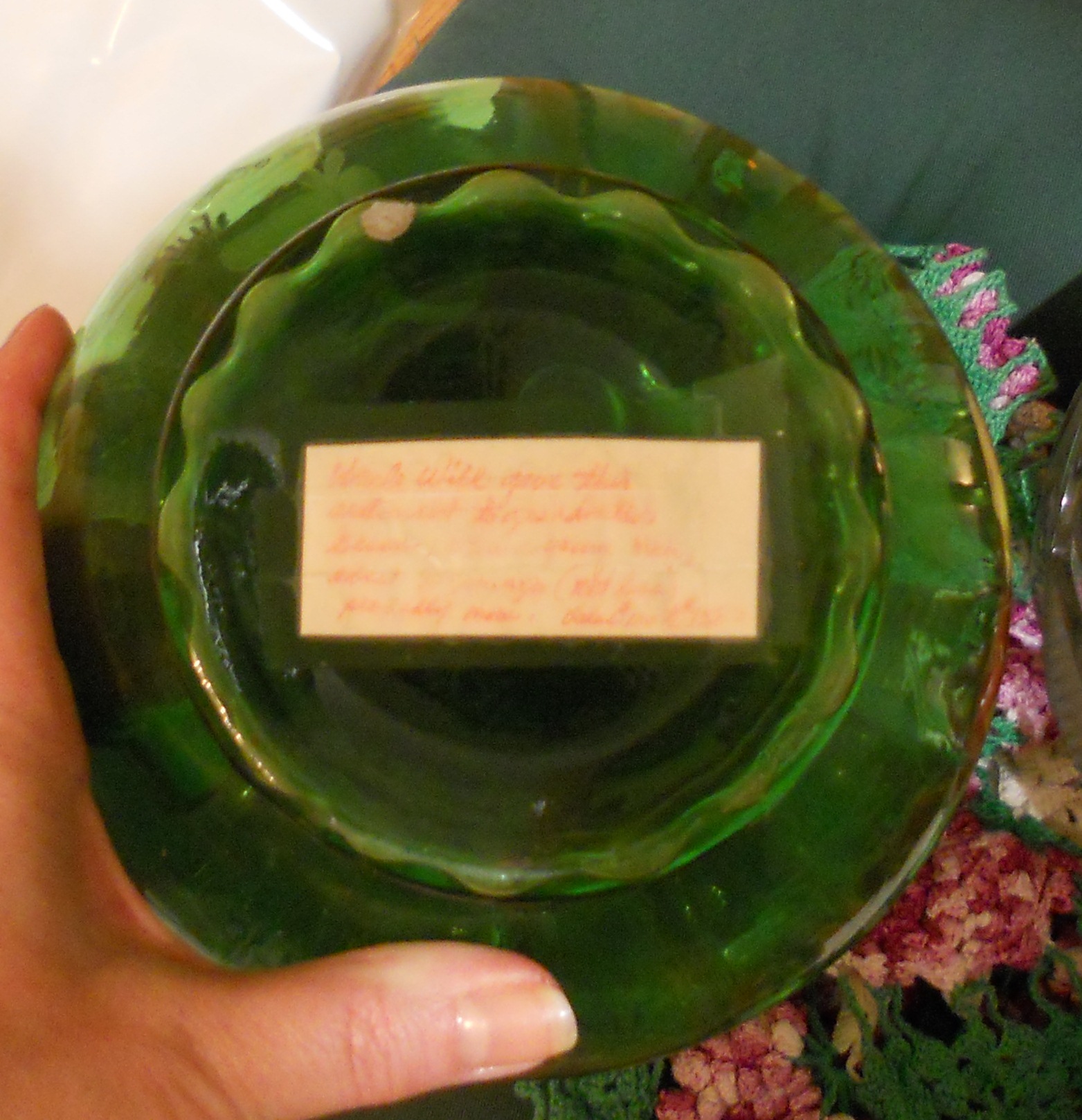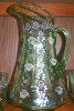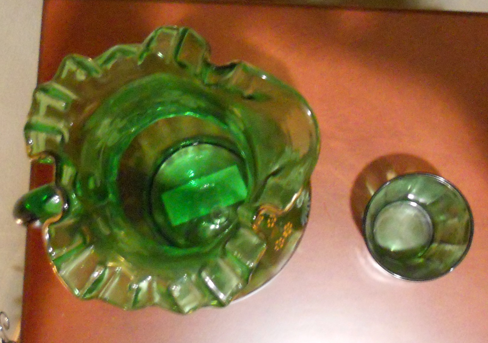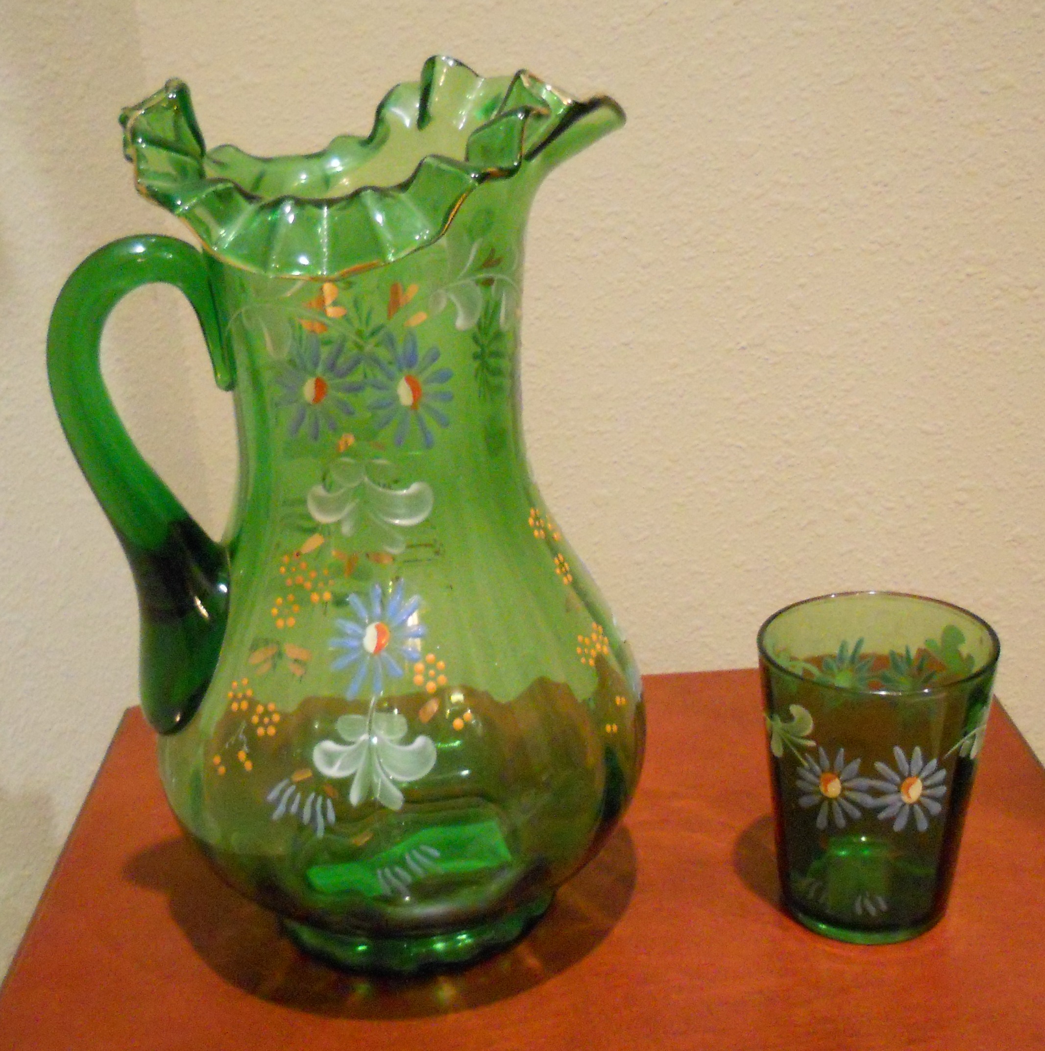 This is a heavy blown glass pitcher of green glass with green blown glass handle attached by the original glass blower. Single surviving drinking class would hold about 6 ounces of fluid and is of of matching green glass, with matching hand painting. Hand painted floral design appears to be blue impressionist daisy petals, white brush strokes for plant stalkes and leaves, tiny orangy dots for another flower. Note attached to base is in my grandmother Clella's handwriting, in red ink, under scotch tape: Uncle Will must be Frederick WIlliam in our family tree 1873-1951, it mentions $158 purchase price, and great-grandmother Cave 1884 -1920.