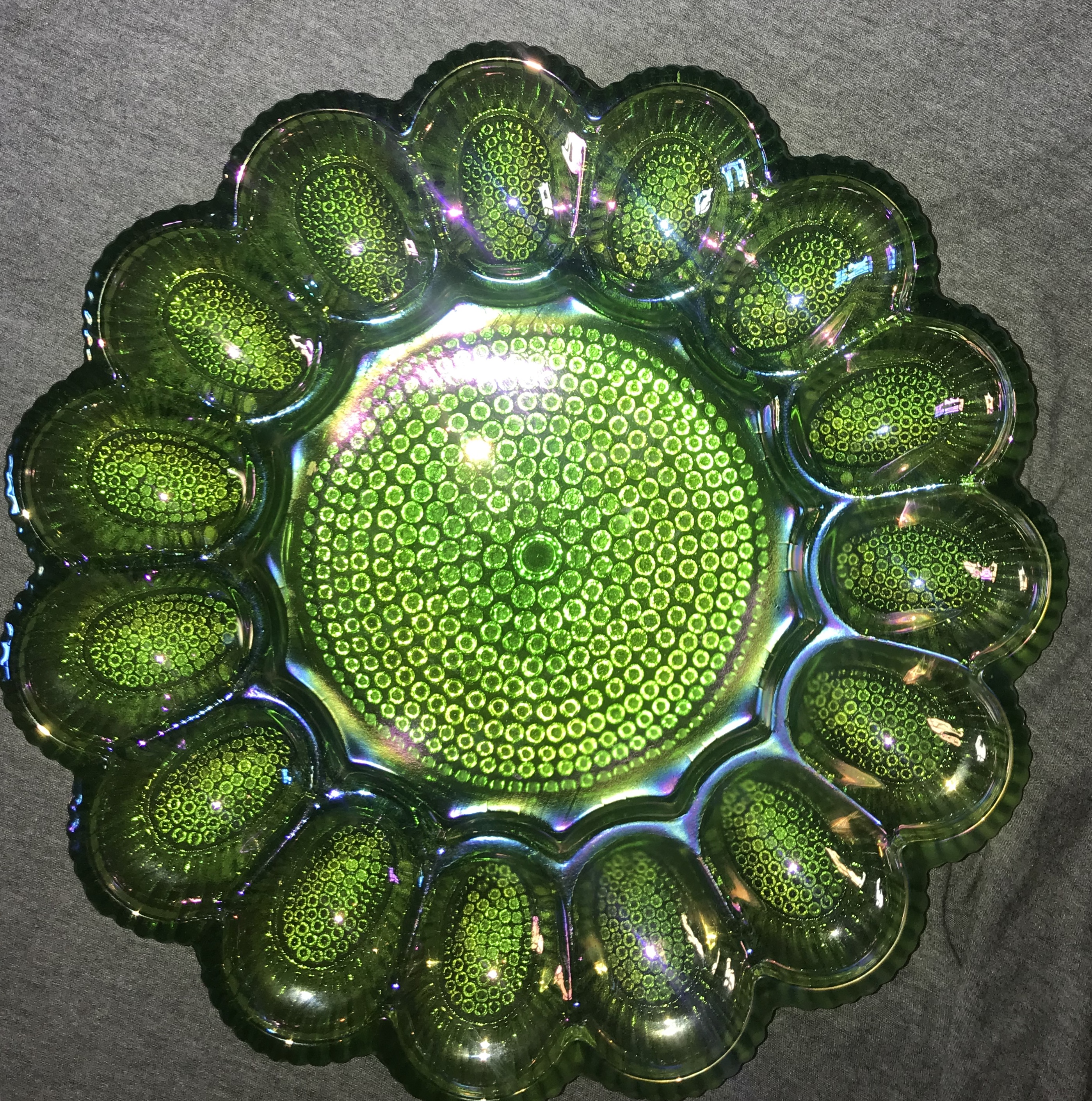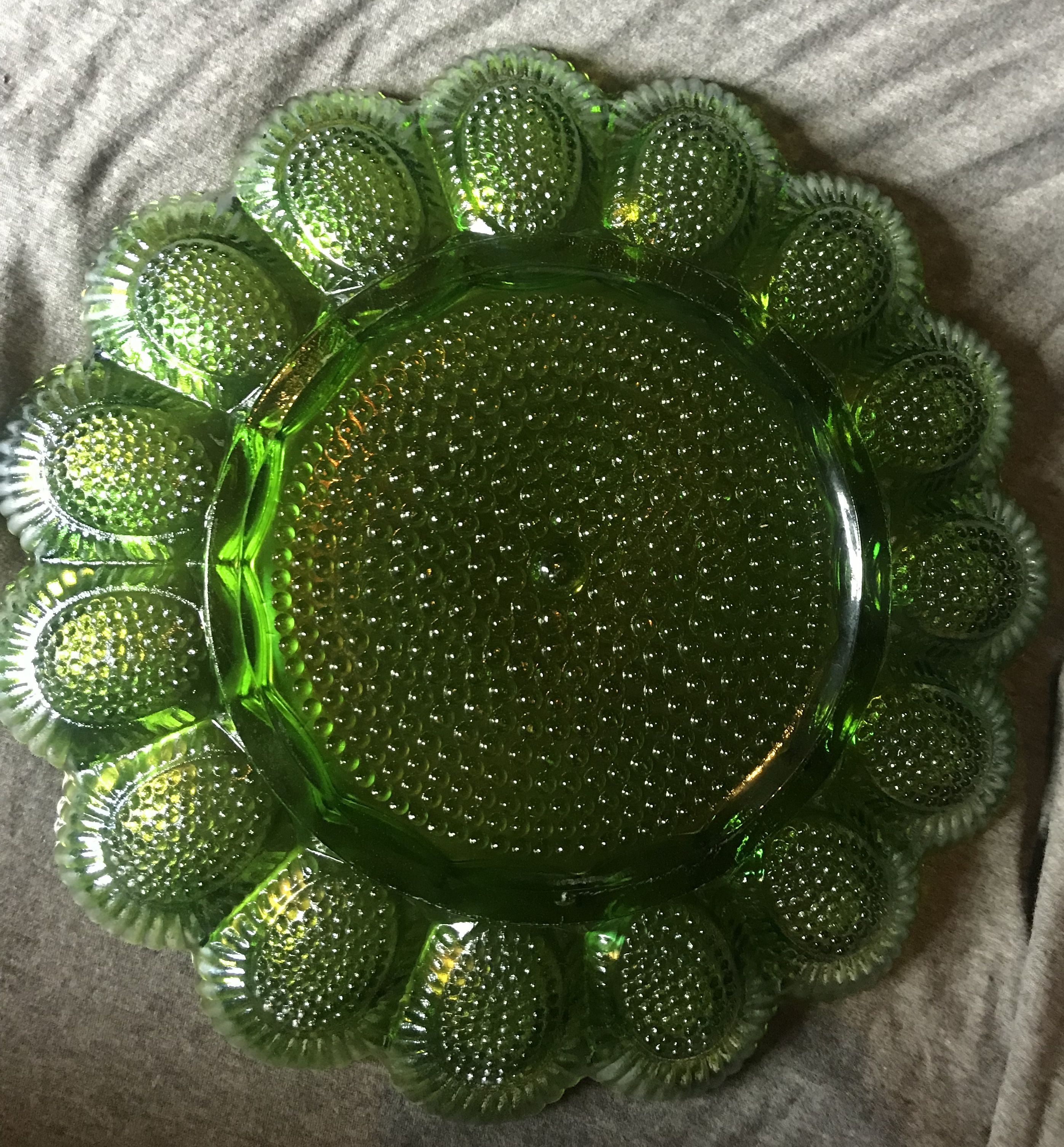 Heavy green vintage egg tray. I think it’s crystal and reflects other colors when turned. It’s quite thick and was a free collectible from my Grandma. It does not have any markings or maker.