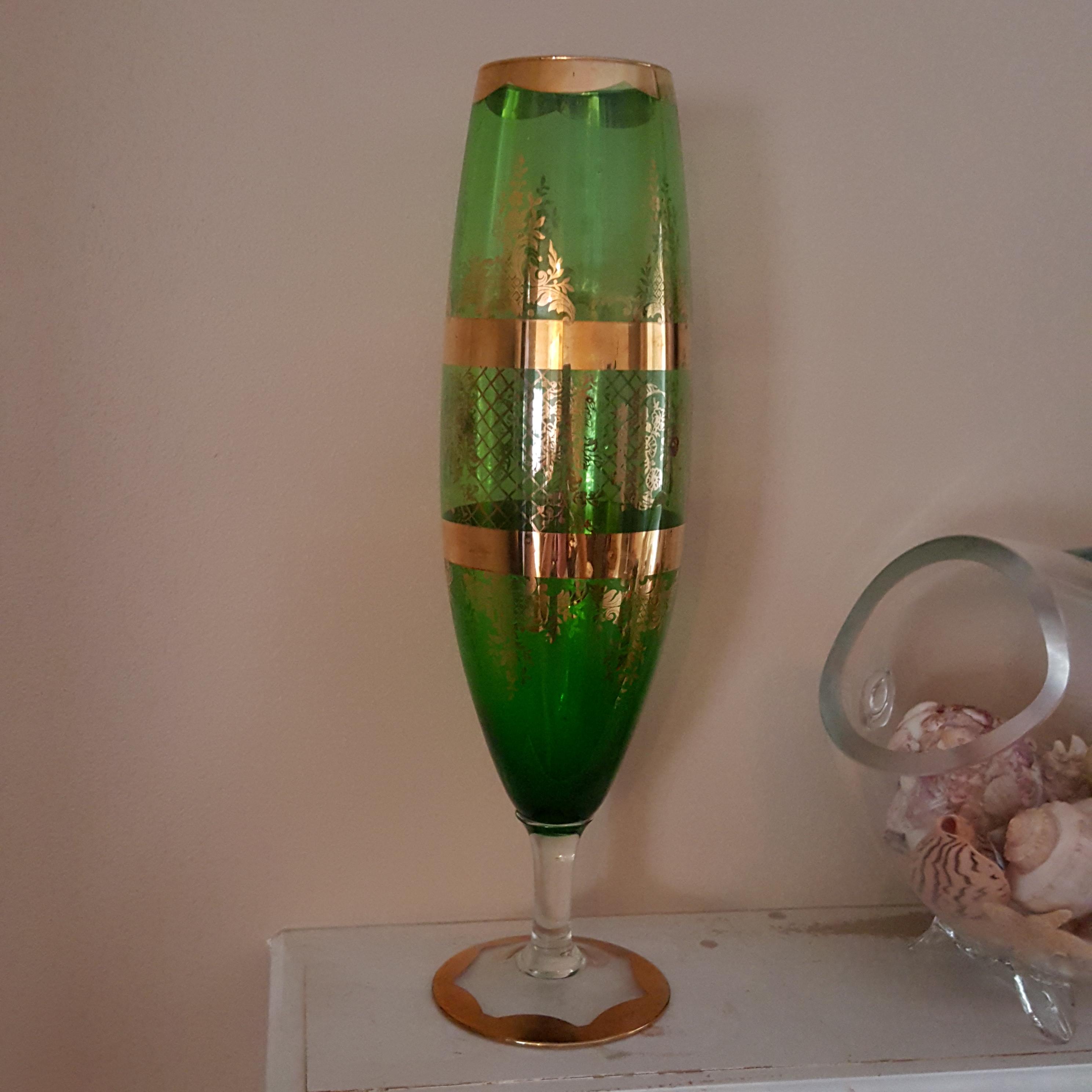 16 inch tall green glass with gold design and trim, two small blemishes on each side where it appears there may have been something like a jewel glued to the glass, given to me by an aunt, would like to know more about this piece