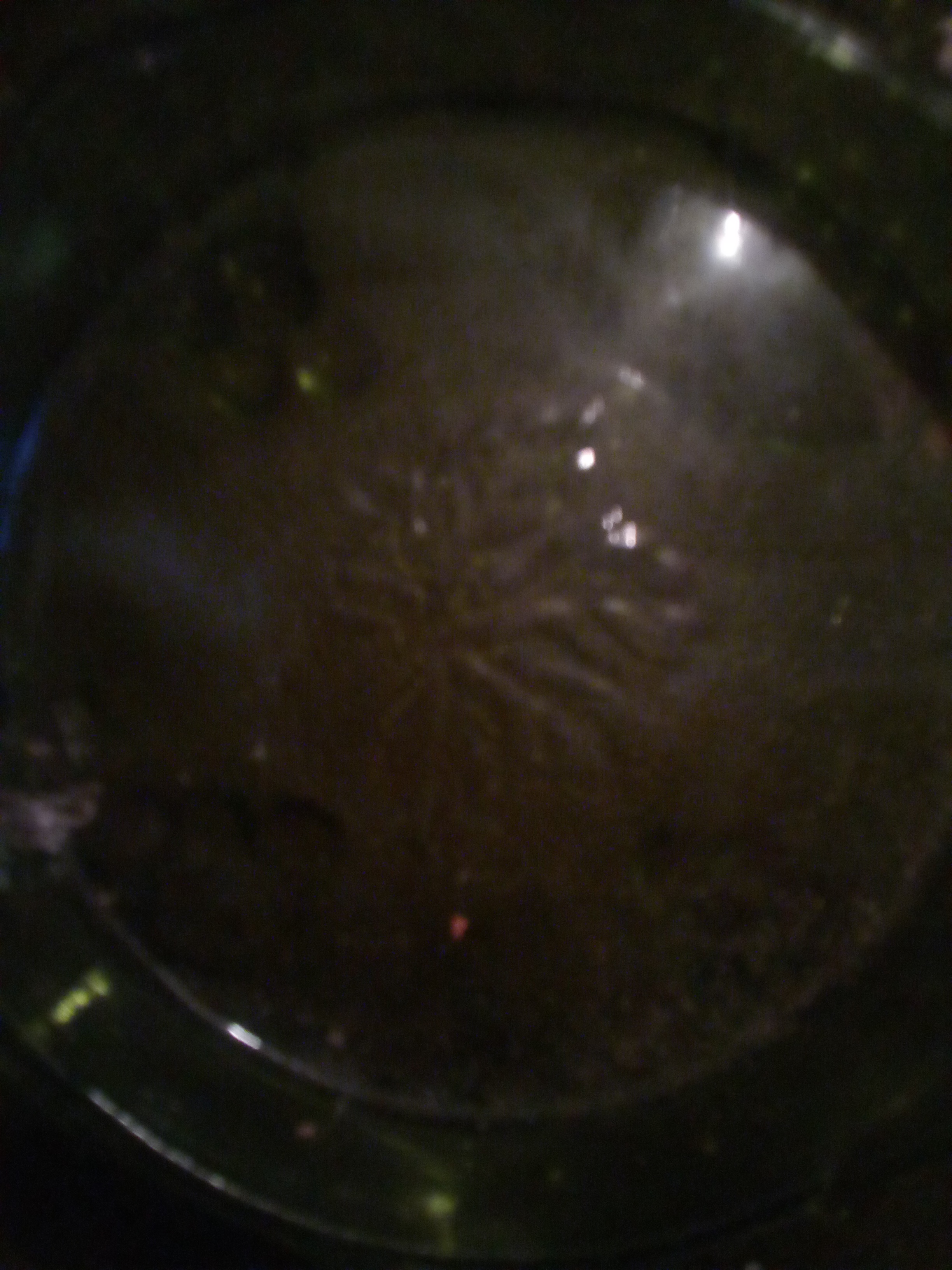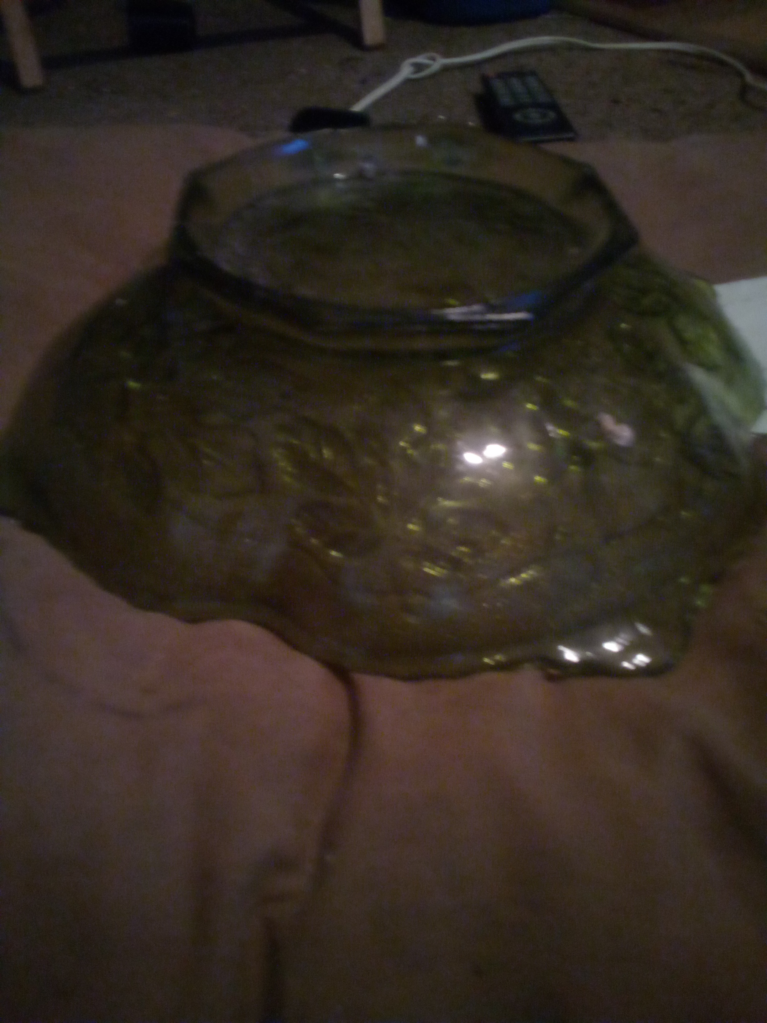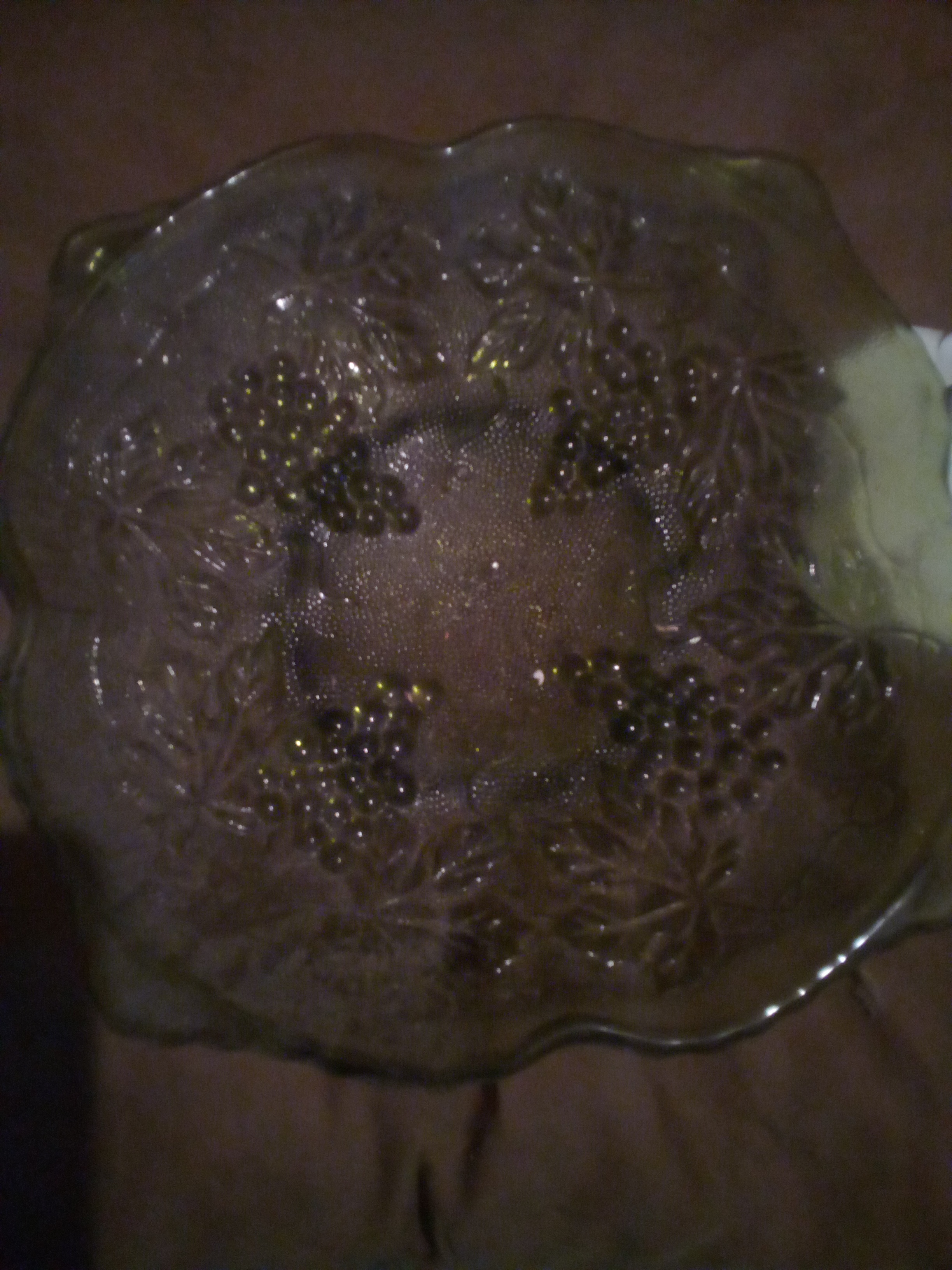 Green Glass Candy Dish with a leaf engraved in the bottom,leaf of a Grape Vine. Has grapes in the dish, raised up on the inside of the Candy dish. 6"-8" round diameter.